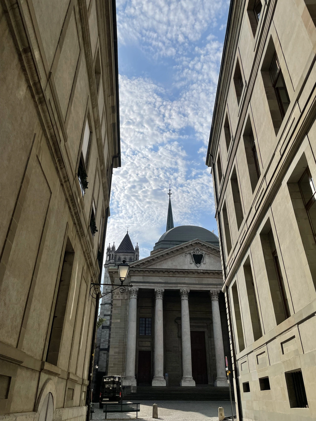 물과 시계의 도시인 제네바의 구도심엔 이곳저곳 시계가 걸려있었고 음용 가능 여부가 쓰여 있는 크고 작은 분수들이 있었다. 언덕을 얼마나 올랐을까 골목 사이로 판테온을 연상시키는 주랑이 보였다. 제네바 성 베드로 대성당이었다. 이곳은 4세기부터 약 1000년간 제네바 주교의 성당이었지만, 종교 개혁을 거치면서 개신교 예배 장소로 사용된다고 한다. 현재 우리가 보는 모습의 기틀을 마련한 시기는 1150년에서 1250년 사이라고 한다. 교회의 개장 시간이 10분 정도 남아 그늘에 앉아 견학 온 초등학생들의 유쾌한 수다를 엿듣다가 주랑 현관을 지나 입장했다. 군더더기가 하나 없이 정갈한 교회였다. 천주교 성당이 익숙한 내게 성상이 없는 교회 건물이 다소 어색하게 느껴졌다. 마치 대성당을 이사하느라 누군가 성상을 박스 안에 다 넣어서 없는 느낌이었다. 이곳에서 대표적인 종교 개혁가 칼뱅은 설교했는데 그가 앉았던 의자가 전시되어 있었다. 나무의자의 앉는 부분이 너무 작아 불편하지 않았을까 생각이 들었다. 10세기가량 미사가 집전되었다가 종교 개혁 이후, 개신교 설교가 이루어지는 역사의 격동을 간직한 교회를 방문하며 공간이 주는 새로움과 함께 유럽 역사의 한 부분을 몸소 느낄 수 있었다.