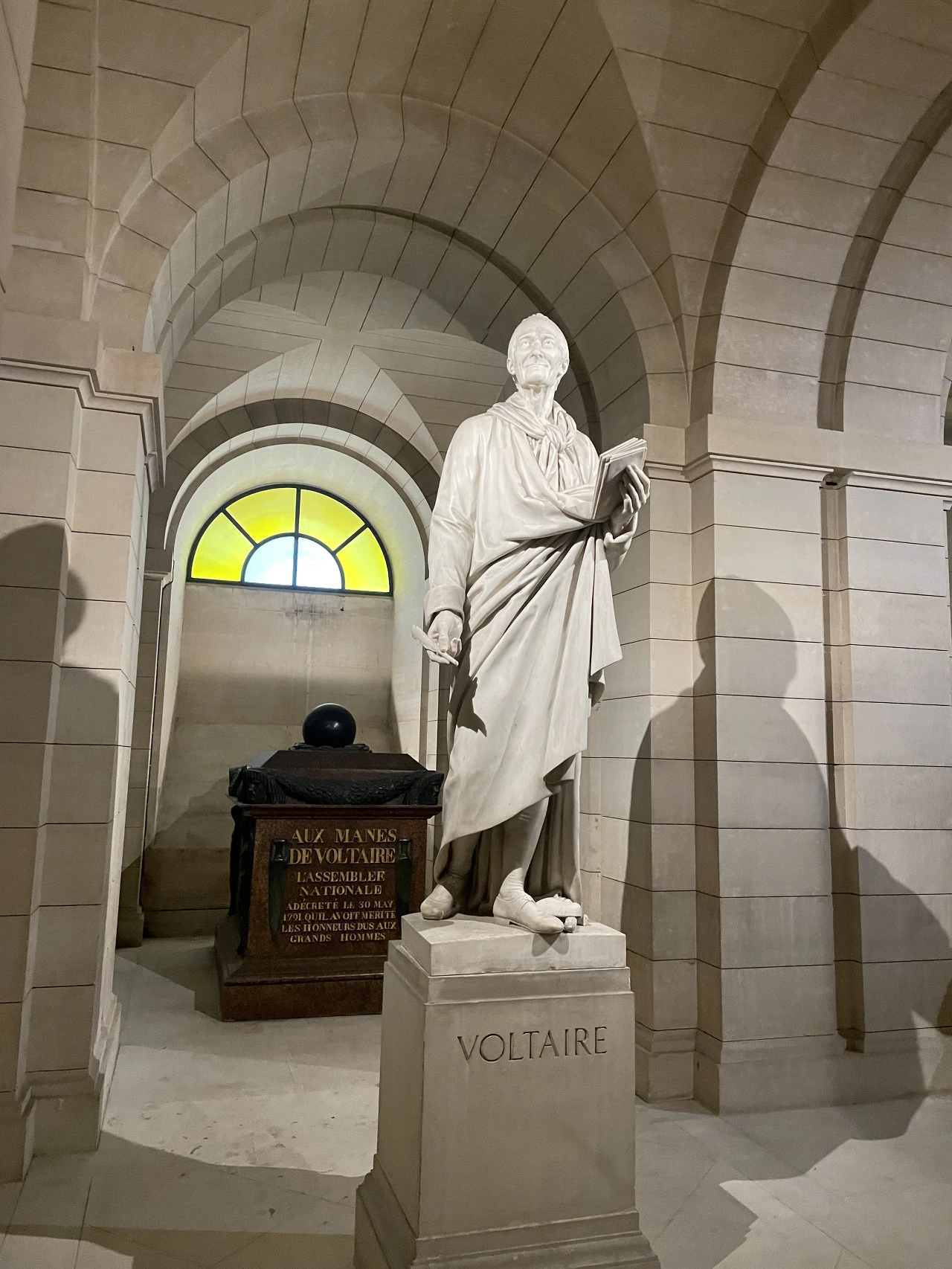 걸어서 10분을 갔을까, 라틴 지구의 중심에 세워진 팡테옹에 도착했다. 수많은 위인이 묻힌 국립 공동묘지답게 수많은 프랑스 국기가 걸려있었고 사람들은 입장을 위해 길게 줄을 서 있었다. 이 자리엔 쥬느비에브 성녀에게 봉헌된 오래된 성당이 있었는데, 1744년 오스트리아 왕위 계승 전쟁 중 병상에 누운 루이 15세가 이 성녀에게 기도를 하고 완쾌하고 나서 감사의 뜻으로 오래된 교회를 재건한 건물이 바로 팡테옹이다. 성 쥬느비에브 성당이었던 이 건축물은 프랑스혁명 후 6번이나 세속적인 정부 건물과 성당으로 바뀌는 정신없는 용도 변경을 겪었다. 팡테옹에 들어서자마자 화려한 프레스코화들과 엄청난 높이를 자랑하는 층고가 펼쳐졌다. 에펠탑을 완공 전인 1889년 이전까진 파리에서 가장 높은 건물이었다고 한다. 프랑스 위인들의 생애가 그려진 프레스코화를 둘러본 뒤, 위인들의 무덤이 보고 싶어 지하로 얼른 내려갔다. 지하실에 들어서자마자 볼테르의 동상과 함께 관이 보였다. 그가 강조한 톨레랑스 정신은 내가 프랑스어를 전공으로 선택한 이유 중 하나였다. 책에서만 보던 인물의 묘지를 방문하는 일은 매우 들뜨는 일이었다. 그 뒤로 빅토르 위고, 에밀 졸라, 장 조레스, 루소, 장 물랑, 앙드레 말로, 마리 퀴리 등의 묘지가 나왔는데, 거리나 광장, 대학 이름으로 붙을 정도로 유명인들과 한 공간이 있을 수 있어서 기뻤다. 한편엔 고인들의 저서가 꽂혀있는 책장 근처에서 잠시 쉬고 마저 구경하다 팡테옹을 나왔다. 팡테옹을 나와 저 멀리 보이는 에펠탑을 향해 갔다.