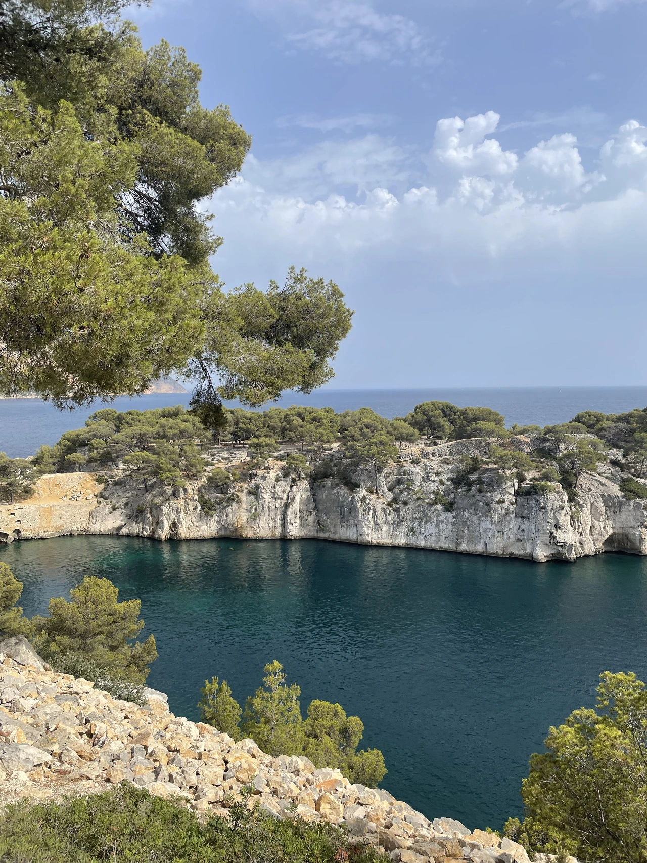 칼랑크에 가기 위해선 칼랑크 국립공원(parc national des Calanques)에 들어가야 했다. 국립공원 초입에서 어떤 여성분이 지도를 들고 서있었다. 나도 모르게 물건 파는 사람인 줄 알고 경계했다. 알고 보니 방문객들이 트래킹 하기 적합한 신발을 신고 있는지 충분한 물을 가졌는지 확인해 주는 분이었다. 그녀는 우리가 가려는 칼랑크 덩보(Calanque d’En-Vau)는 1시간 더 가야 하고 마실 물이 1.5리터 정도 필요하다고 알려주셨다. 그리고 바닥이 미끄러우니 조심하라고 일러주셨다. 물은 바로 옆에 있는 가게에서 살 수 있었는데, 현금만 받는 곳이었다. 주머니엔 단돈 2유로 동전 하나밖에 없었고 500밀리리터 물 밖에 살 수 없었다. 물을 아껴 마시며 다이빙하는 사람들을 구경하고 미끄러운 석회암을 조심조심 디디며 목적지로 향했다. 미끄럽고 험한 돌길을 지나서야 마침내 카시스에 온 이유인 칼랑크 덩보에 도착할 수 있었다.