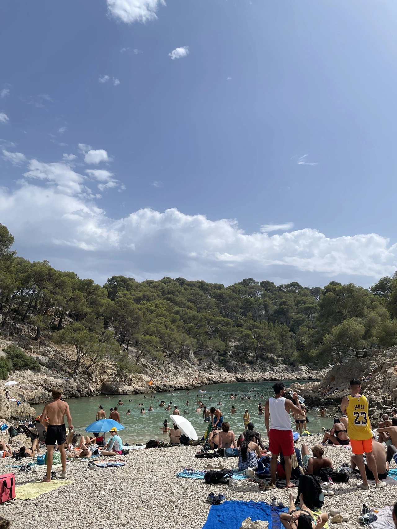 작은 시골 역인 카시스 역은 뜨거웠고 분홍 꽃이 오래된 역 건물을 덮고 있었다. 역을 나와 한 칼랑크를 검색하니 걸어서 2시간이 걸린다고 나왔다. 버스를 탈 수도 있었지만, 일단 걷기로 했다. 아마 여행은 자고로 걸어서 해야 한다는 개똥철학과 한 푼이라도 아껴야 한다는 주머니 가벼운 학생의 눈물겨운 몸부림이 합쳐진 결과일 것이다. 뜨거운 햇볕 아래서 사과를 먹으며 원색의 꽃들과 열대 나무들이 황토색 집들이 아름답게 어우러진 마을과, 흰 석회암이 깔린 포도밭을 마주쳤다. 사유지라고 적힌 팻말 뒤에는 포도밭에 둘러싸여 있는 울창한 나무에 비밀스럽게 가려져 있는 농부의 집이 보였다. 1시간을 걸었을까 건물 사이로 바다가 점차 모습을 드러났고, 유럽에서 가장 높은 해안 절벽 중 하나인 카나이 곶( Cap Canaille)이 눈앞에 펼쳐졌다. 시내엔 작은 성당이 길 곳곳에 있기로 유명한데 이번 여행에서 도심을 볼 시간은 없었다. 카시스 항을 지나 베스투앙 해변(Plage du Bestouan)에 도착했다. 작고 아름다운 몽돌 해변에 많은 사람이 비치타월을 깔고 일광욕하고 있었다. 여기서 놀까 고민했지만, 이왕이면 시내에서 멀리 있는 칼랑크 해변으로 가기로 했다. 고급 빌라들을 지나며 여유롭게 휴양을 즐기는 사람들을 거슬러 칼랑크를 정복하기 위한 투사처럼 발걸음이 이어갔다. 날씨와 투쟁을 하며 계속 걷자, 어느새 도로는 흙길로 바뀌었다.