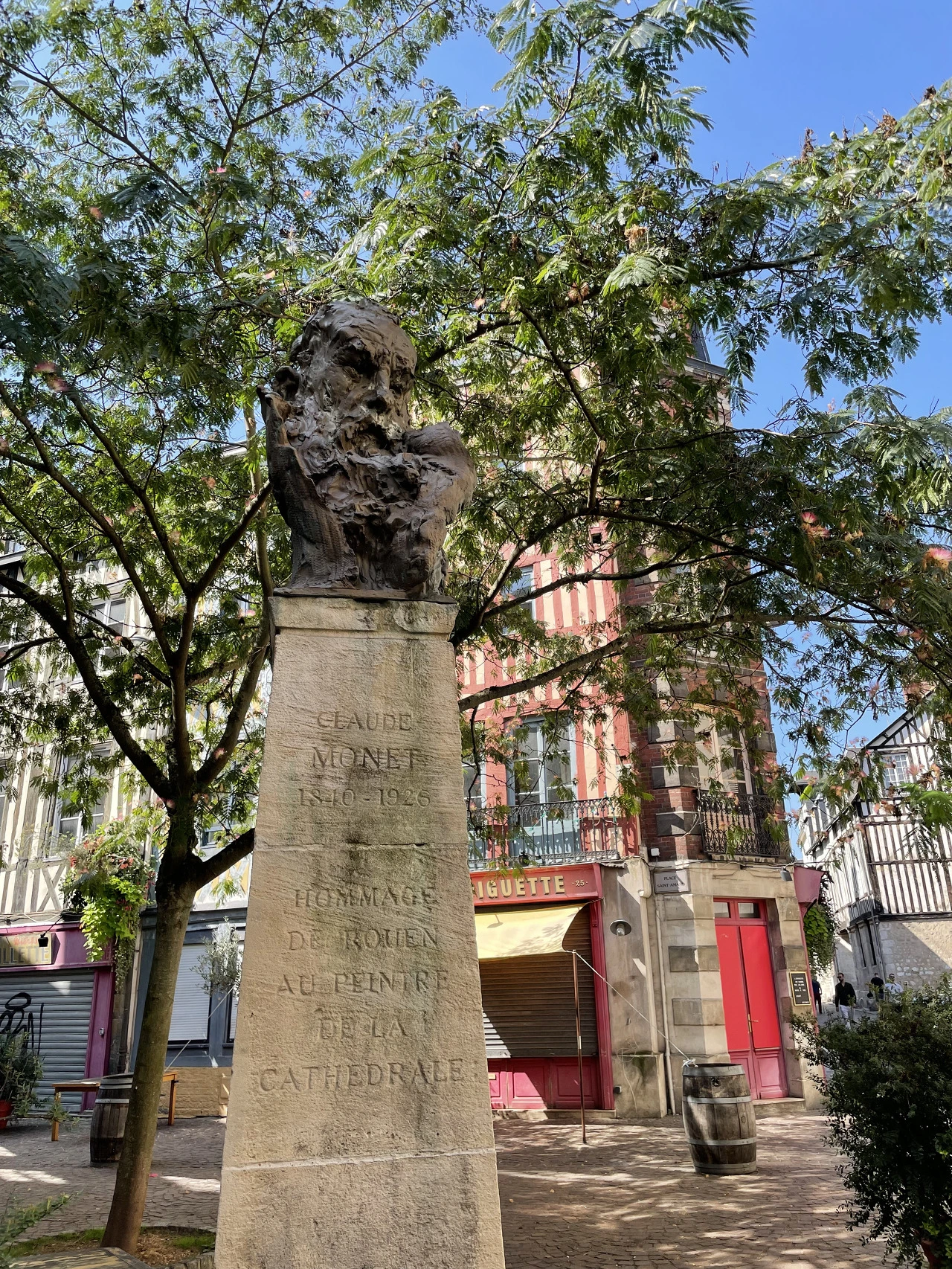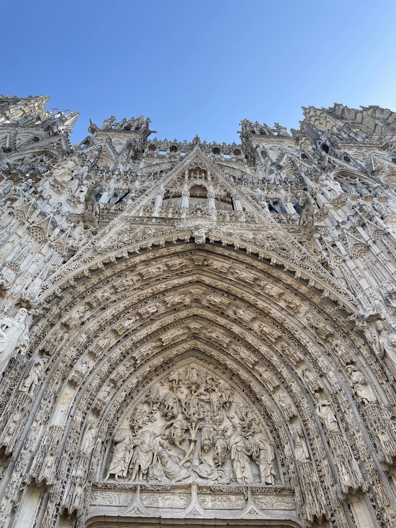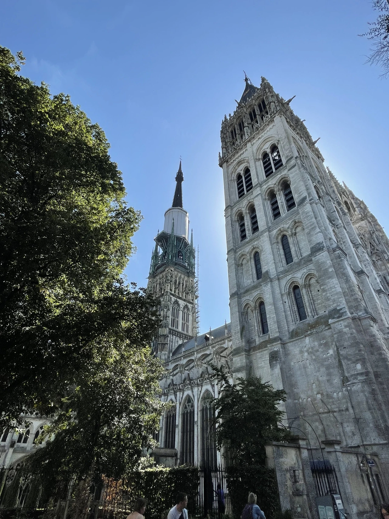 햇볕을 맞고 피하기를 반복하며 걷자, 시청 앞에 놓인 나폴레옹 기마상에 다다랐다. 바로 옆엔 거대한 건물이 있었는데 규모를 보아 대성당임을 확신했다. 하지만 성당의 전면은 보수공사 중이어서 전부 가려져 있었다. 여기까지 와서 그 유명한 루앙 대성당을 못 들어가나 좌절하며 구글 지도를 켰다. 이제 어딜 가야 하나 지도를 들여다보니 다행히 루앙 노트르담 대성당은 근처 다른 곳에 있었다. 실망감은 희망으로 바뀌었고 대성당에 금방 도착했다. 화려하고 거대한 성당의 서쪽 파사드를 멀찌감치 서서 바라보았다. 넓이가 61미터에 달하는 파사드엔 70개의 인물 조각상이 놓여있었고, 양옆엔 서로 모양과 높이가 다른 생 로망(Saint-Romain) 탑과 버터탑(tour de Beurre)이 서 있었다. 생 로망 탑엔 프랑스에서 가장 무거운 종이 달려 있다는 점도 신기하지만, 버터탑의 이름이 왜 이렇게 지어졌는지 더 궁금했다. 이 탑의 이름을 설명하는 두 가지 설이 있다고 한다. 첫 번째 설은 성당은 전체적으로 흰색 돌로 지어졌는데, 이 탑은 당시 버터와 비슷한 노르스름한 색을 띠는 돌로 건축되었다는 것이고, 두 번째는 이 탑 지을 돈을 모금하기 위해 헌금을 내면 금식과 금육을 해야 하는 시기에 버터를 먹을 수 있는 권리를 주면서 지금의 이름이 붙여졌다는 이야기가 있다. 성당에 들어가려고 이 비대칭인 파사드에 점점 다가가자, 웅장함 속에 가려져 있던 섬세함과 화려함이 모습을 드러냈다. 건물 내부에도 수많은 성인상과 오래된 스테인드글라스가 있었다. 대성당에 들어가자마자 2명의 무덤을 찾아다녔다. 바이킹족의 수장이자 서프랑크 왕 샤를 3세에게 노르망디 지방의 일부를 영지로 받고 911년에 루앙의 백작 작위를 받은 롤로의 무덤과 십자군에 참여한 노르망디의 공작이자 잉글랜드의 왕, 사자왕 리처드의 심장이 안치된 곳이 있기 때문이다. 성당을 한 바퀴 도는 동안, 무덤 하나를 찾았다. 하지만 관 위에 설명이 라틴어로 적혀있어서 주인이 누군지 알 수 없었다. 심장은 도대체 어디에 있는지 찾을 수 없었다. 그렇게 아쉬움을 남긴 채 다시 광장으로 나와 루앙 대성당을 프랑스에서 가장 높고, 세계에서 4번째로 높은 성당으로 만든 151미터의 첨탑을 구경하고 발길을 돌렸다.