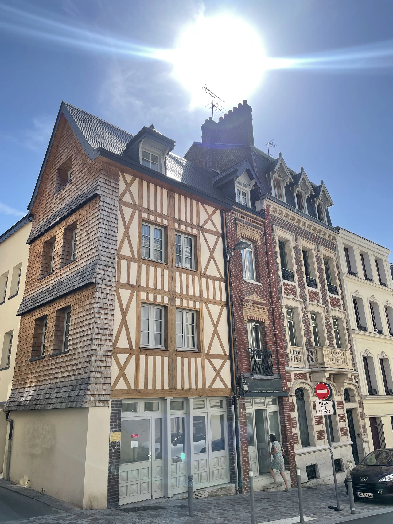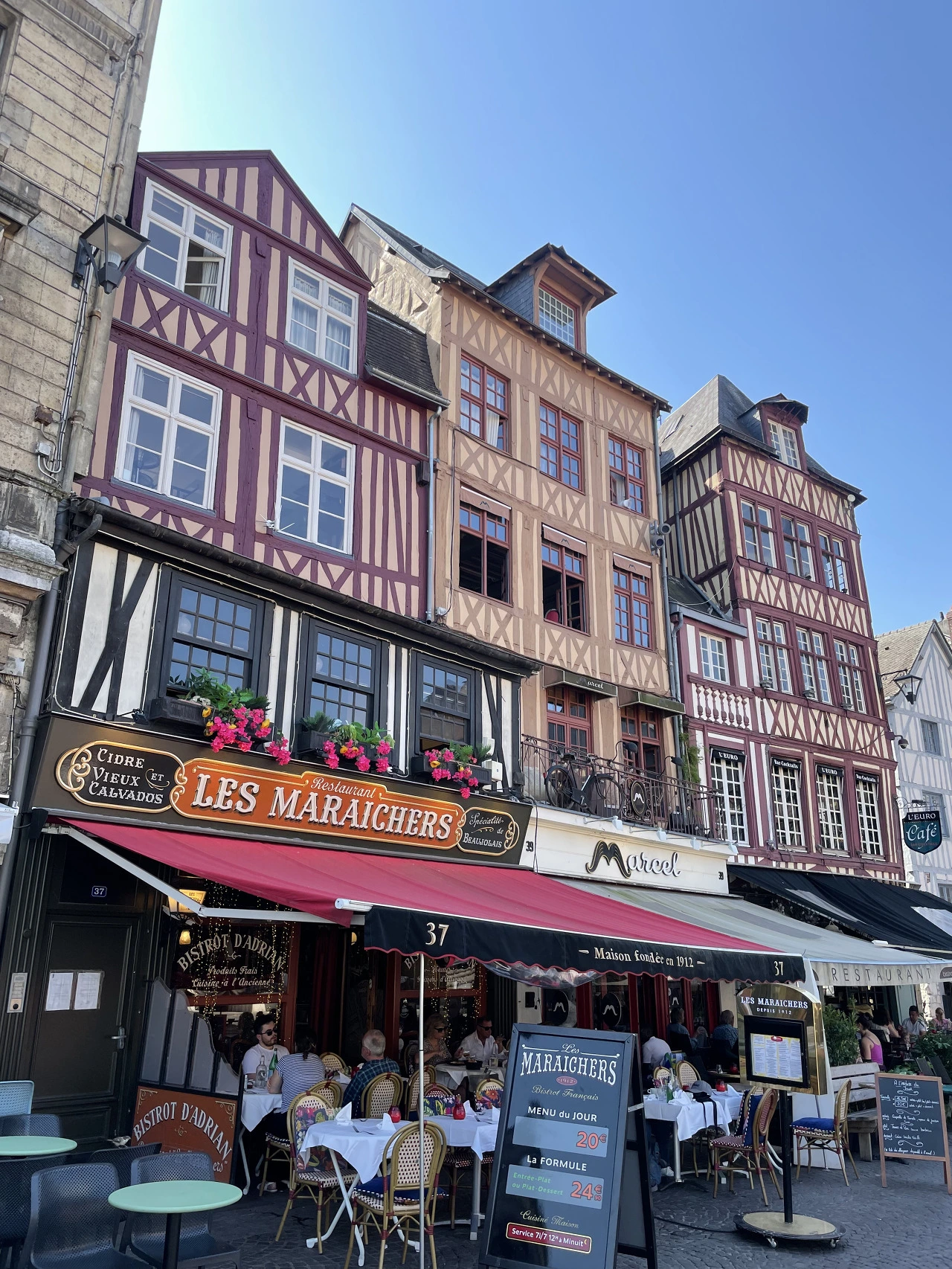 루앙은 인적 드문 골목을 지날 때조차 목조 골조를 들어낸 전통가옥(maisons à colombages)이 즐비하게 늘어서 있었다. 현재 이러한 전통 가옥이 루앙에 2000채가 남아있다고 한다. 또한 중세 시대에 지어진 가옥이 200채가 보존되고 있었다. 나무 골조의 질감이 어떨지 궁금해서 손으로 한번 만져보았다. 거칠거칠해서 조금 세게 문지르면 가시가 박힐 것 같았다. 벽돌과 콘크리트로 지어진 집들 사이에 놓여있는 전통 가옥들은 알록달록한 색깔로 자신의 존재감을 드러내고 있었다. 중세 시대의 루앙은 섬유산업과 항구로 프랑스 왕국의 두 번째 도시로 융성한 곳이었다고 한다. 도시의 인구가 점점 늘어나면서 루앙을 둘러싸고 있는 숲에서 목재를 구해 목재 골조가 드러난 집을 지었다고 한다. 노르망디의 이러한 건축양식은 영국 남부 지역의 방식과 많은 공통점을 공유하고 있는데, 이 사실은 바이킹과 그들의 후손이 노르망디와 잉글랜드를 다스리던 시기를 떠올리게 했다.