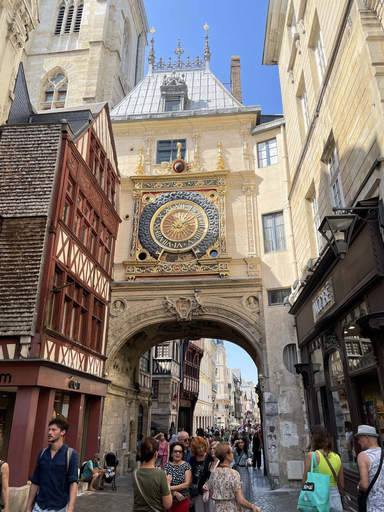 점점 많아지는 관광객들의 무리를 따라가다가 저 멀리 루앙 대시계(Le Gros-Horloge)가 보였다. 고딕 종탑과 르네상스 시대에 지어진 아치형 건물에 걸려있는 황금색 시계가 밝은 햇볕을 받자 다른 시대로 시간여행을 하는 느낌을 주었다. 1389년에 만들어진 시계는 달의 위상과 요일도 알려준다고 한다. 그리고 시곗바늘엔 13세기부터 루앙의 상징인 양이 붙어있어 시간을 알려주고 있었다. 이곳은 시계뿐만 자체만이 아니라 이름도 불문과인 나를 자극하기 충분했다. 시계(horloge)는 여성형인데 대시계(le gros-Horloge)는 남성형으로 쓰인 것이다. 이는 시계가 만들어질 때만 해도 남성형이었던 단어가 16세기에 이르자 여성형이 되었다고 한다. 하지만 사람들의 언어 습관은 쉽게 변할 리 없었고 루앙 사람들은 계속 중세의 문법을 유지한 것이다. 결국 이 시계의 정식이름은 19세기말 남성형으로 남게 된다고 한다. 아름다운 중세의 시계와 그 밑을 지나가는 꼬마 기차가 내뿜는 명소의 분위기를 만끽하며 또다시 루앙의 골목길을 걸어 한 광장을 향했다.