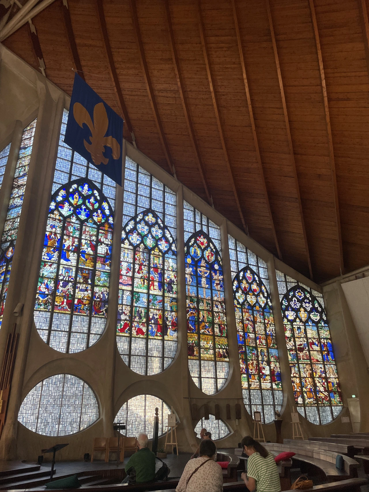 비유 마르쉐 광장(Place du Vieux-Marché)에 도착했다. 광장 주변엔 많은 전통가옥이 있었고 그중 한 집에는 다른 나라 국기들과 함께 태극기도 걸려있었다. 광장 가운데엔 독특한 스타일의 성 잔다르크 성당이 있었다. 성당 내부는 부르봉 왕가를 상징하는 백합으로 장식되어 있었고, 화려한 스테인드글라스는 성인들의 삶을 보여주고 있었다. 천장은 나무로 지어졌는데 바이킹의 배 속에 있는 듯한 느낌을 주었다. 성당에 앉아 더위를 시키고 밖으로 나가 잔다르크가 화형 당한 장소를 찾아보았다. 표시판이 잘 안 보여 풀숲으로 다가갔는데 풀숲 안에서 쥐들이 움직이는 소리가 들려 더 이상 가까이 가진 못했다. 멀리서 그 자리에 서 있는 십자가를 보면서 프랑스 영토에서 영국을 물리친 구국 영웅 잔다르크가 아닌 부르고뉴 군대에 포로로 잡혀 영국군에 팔린 뒤 종교재판을 받고 19살에 화형 당한 한 소녀의 고통에 안타까운 마음이 들었다. 광장에서 나와 걸어가는데 그늘에 앉아있던 분이 인사하며 한국에서 왔냐고 물었다. 그러면서 악수를 청했는데 잠시 이상한 사람이 아닐까 생각했지만, 악수하고 보자르 미술관으로 향했다.