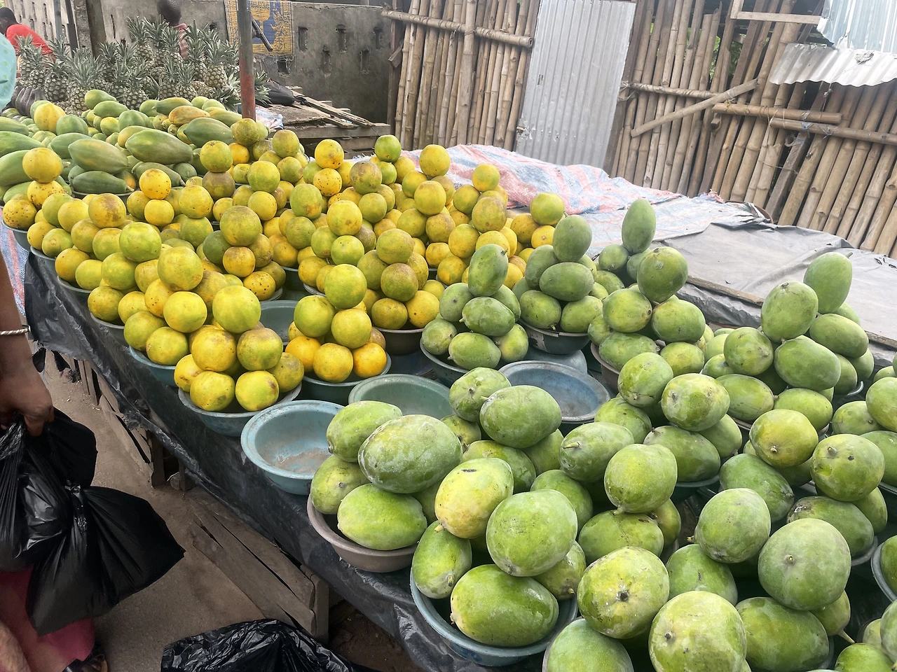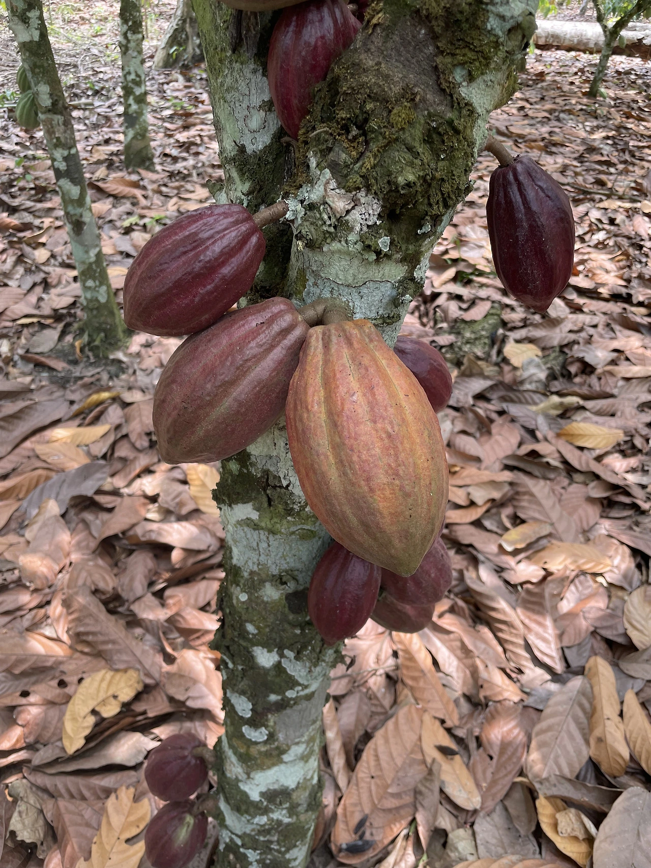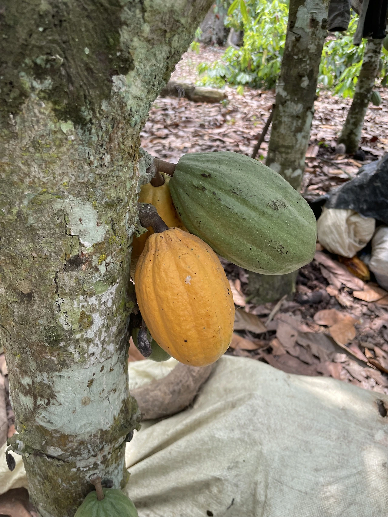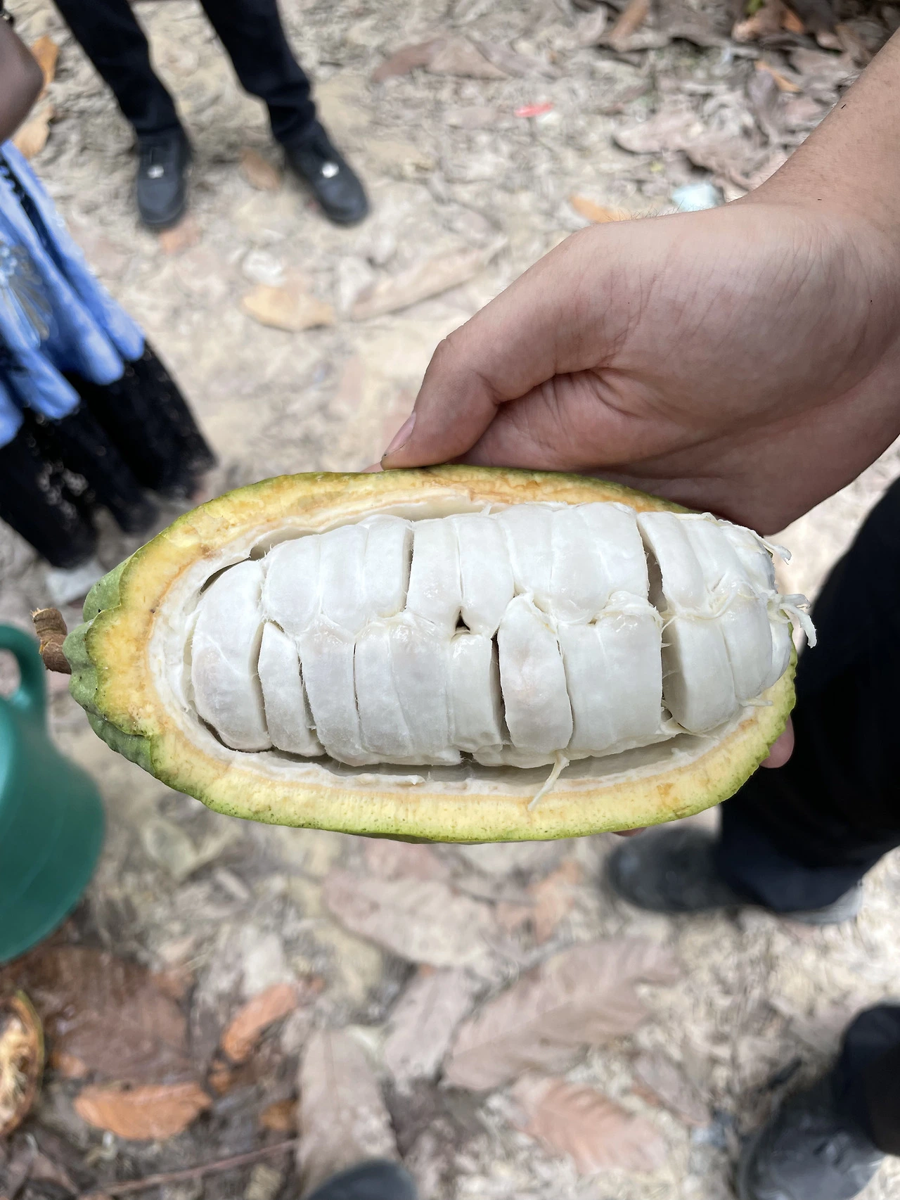 수풀 속으로 난 신작로를 따라 15분쯤 갔을까 잘 정돈된 농장이 모습을 드러냈다. 2헥타르 규모의 농장에서 자란 카카오나무엔 카카오가 주렁주렁 달려있었다. 우리에게 카카오가 잔뜩 달린 모습을 보여주고자 수확 시기를 1주일 미뤘다고 하셨다. 농장에 심겨 있는 카카오는 3가지 종류였다. 가나 카카오, 프랑스 카카오, 코트디부아르 카카오. 카카오 경작자들이 카카오 열매를 구분하는 용어를 듣고, 카카오 생산 강국인 코트디부아르, 가나 이름이 붙은 카카오는 납득이 갔지만, 프랑스 카카오는 어떻게 이 용어로 불리게 되었는지 궁금해졌다. 경작자들의 설명에 따르면, 프랑스 식민통치 시절, 코트디부아르에서 가장 먼저 경작된 카카오 품종이어서 프랑스 카카오라고 부른다고 한다. 이 세 명칭이 정식 이름은 아니고, 농민들이 쉽게 카카오 종류를 구분하기 위해서 사용하는 표현으로 추측해 본다. 카카오 농장을 거닐며 설명을 듣고 있는데, 카카오 열매를 따 주시며 먹어보길 권했다. 흰 카카오 과육을 입에 넣자, 망고스틴 맛이 났다. 하지만, 과육이 씨를 얇게 싸고 있어 먹을 만한 부분이 많진 않았다. 그리고 씨가 그리 단단하지 않아, 씹으면 부서져 텁텁한 맛이 났다. 한번 과즙을 빨고 뱉는 식으로 과육을 맛보는 수밖에 없었다. 그 씨를 카카오 껍질 속에 넣고 발효시키면 발아한다고 한다. 그리고 씨 2~3개를 넣고 물을 주면, 묘목이 자란다. 이렇게 18개월을 키우면 카카오 열매를 수확할 수 있다. 씨를 심지 않고 수확하여 건조하면 우리가 먹는 초콜릿 원료가 된다. 카카오 100%를 처음 맛보았는데, 당연히 맛있진 않았지만, 또 못 먹을 정도로 쓰진 않았다. 그렇게 카카오 반쪽을 혼자 다 먹으며 망고스틴 먹는 기분을 내며 농장을 구경했다.