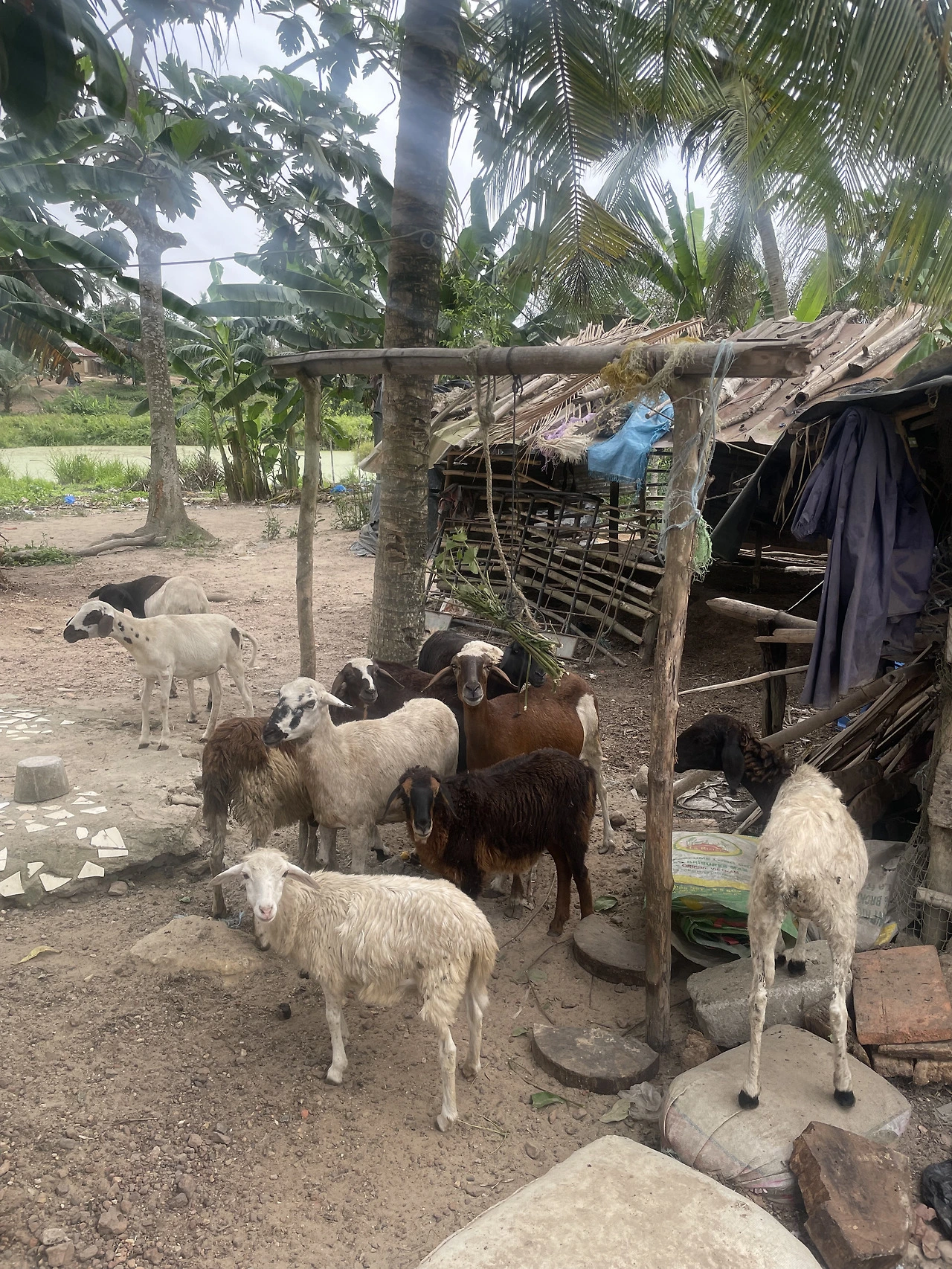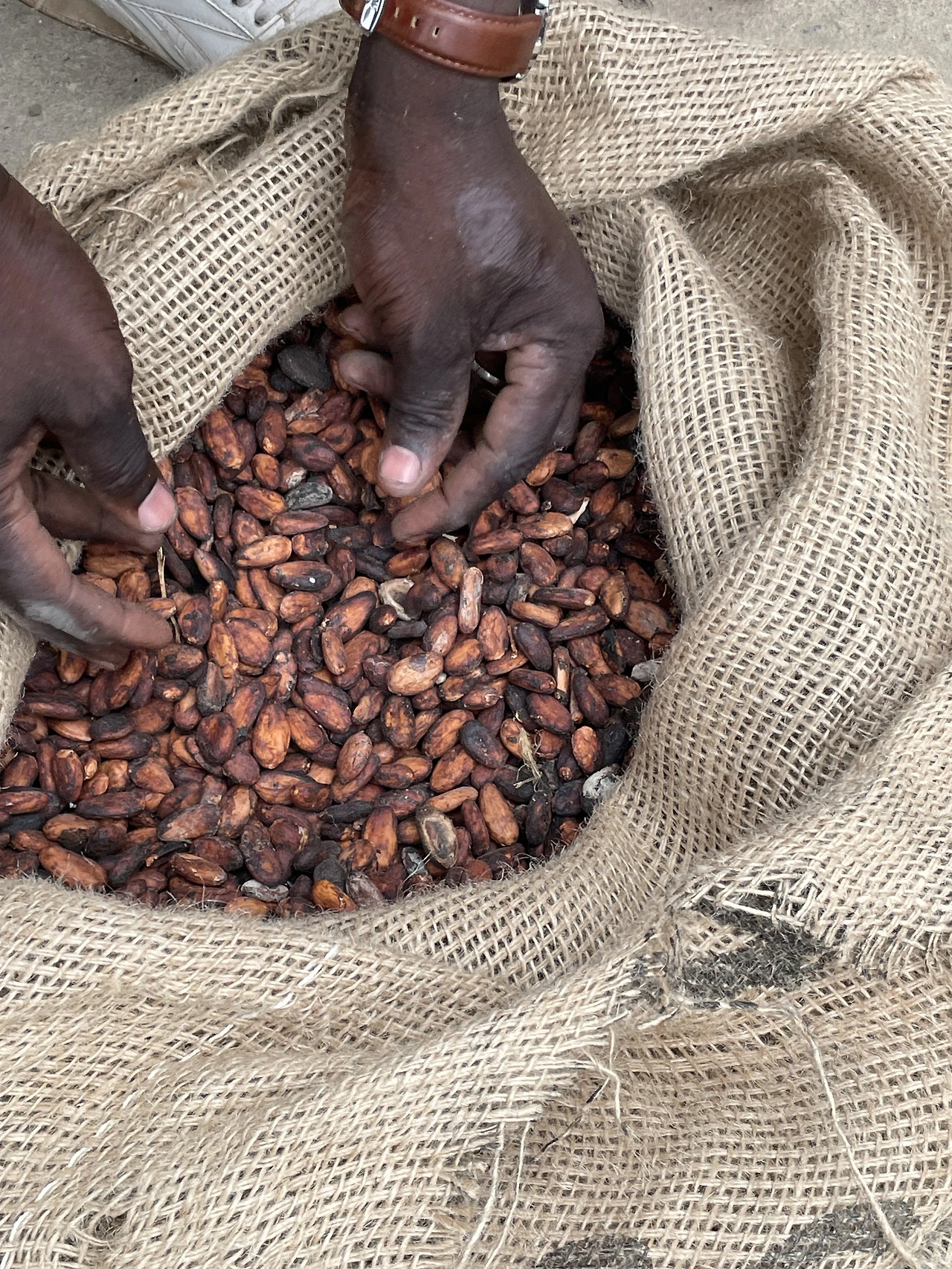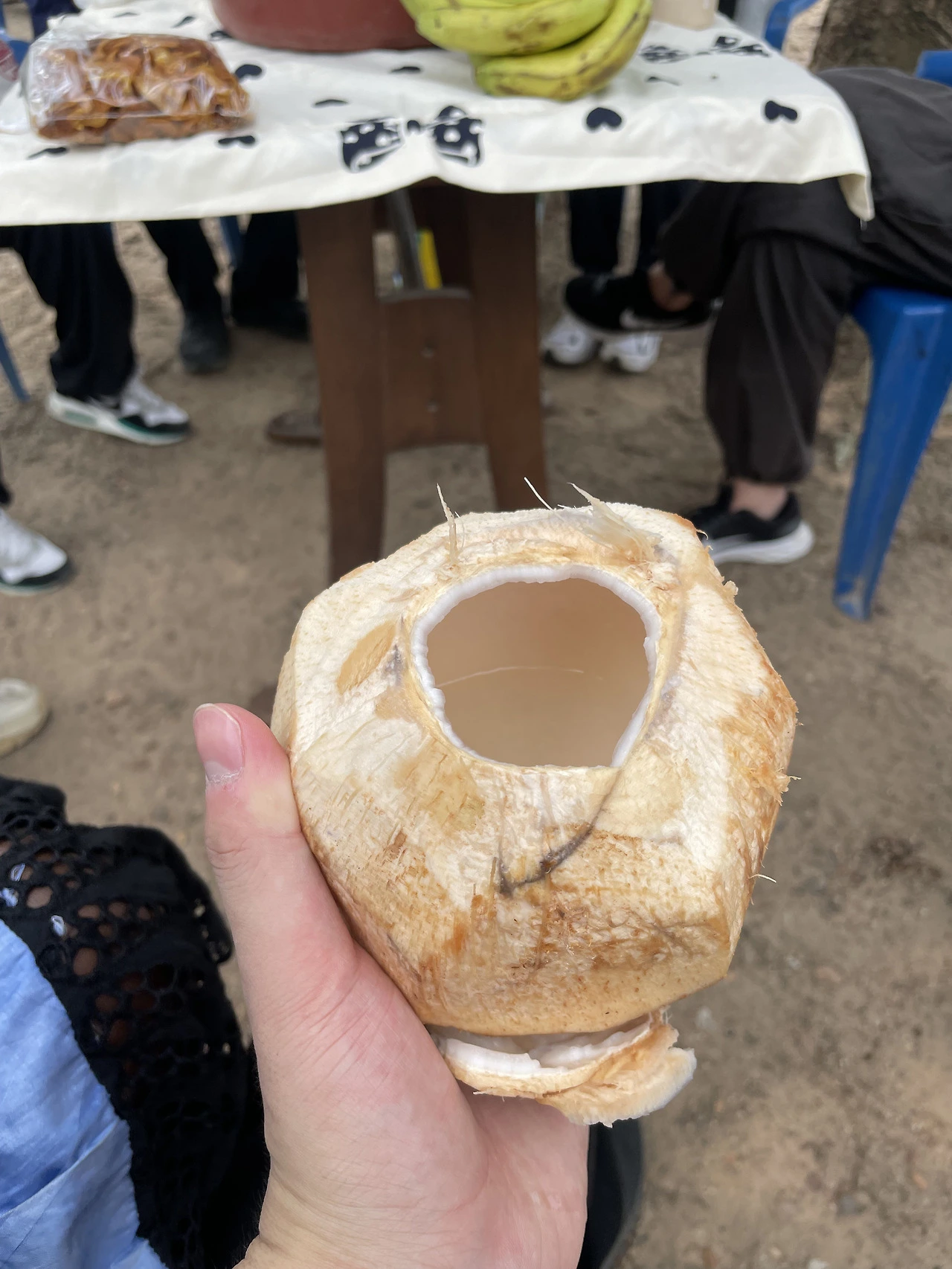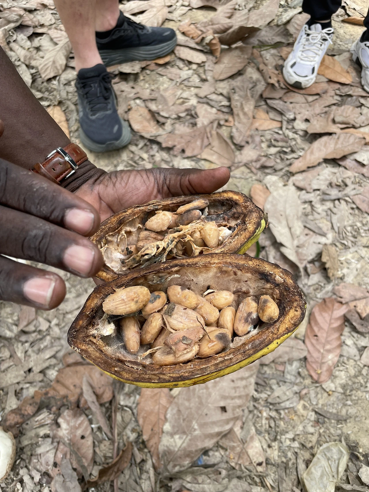 카카오 농장을 방문하기 전, 이곳에 초대해 준 직장 동료의 가족이 지내는 마을을 방문하여 인사를 나눴다. 마당엔 염소와 닭들이 뛰놀고 있었고, 테이블 위엔 미리 수확한 코코넛이 한가득 있었다. 마체테로 코코넛을 따자 엄청난 양의 달콤하고 시원한 물을 마실 수 있었다. 목을 충분히 축이고, 농장으로 떠났다. 차에 에어컨이 없고 창문도 활짝 열리지 않는 관계로, 더우면 차 문을 열어야 했다. 열린 문으로 동네 사람들과 직장 동료가 나눈 수많은 인사가 지나갔고, 어느새 마을 지도자의 집 앞에 도착했다. 코트디부아르에선 외지인이 마을에 들어오면 마을 지도자에게 인사를 하고 누구의 지인인지와 방문 목적 등을 이야기해야 한다. 하지만, 다행히 집에 계시지 않아, 우린 곧장 농장으로 출발할 수 있었다.