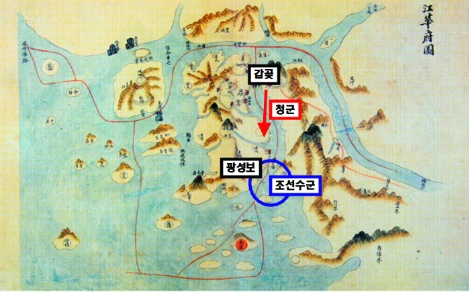 정축년 정월 22일(1637년 2월 16일) 오전 10시 30분, 강화도와 김포 사이를 흐르는 염하수로의 조류가 밀물에서 썰물로 바뀌었고, 방향 역시 북에서 남으로 흐르기 시작했다. 마치 이를 이미 알고 있던 것처럼 김포 북쪽 갑곶에서 대기하던 청군은 흥룡강에서 쓰이던 작고 날렵한 배에 올라 조류를 타고 손쉽게 강화도에 상륙했다. 만일 청군이 상륙할 경우 유빙이 어는 갑곶을 택할 리는 없다고 여겨 강화도 남쪽의 광성보를 지키고 있던 강도유수(江都留守) 장신의 함대는 뒤늦게 사태를 파악했으나, 조류의 방향도 방향이고 무엇보다 수심이 너무 얕아 북상하지 못했다. 조선의 ‘무적함대’가 할 수 있었던 건 그저 청군의 도해를 무력하게 바라보는 일뿐이었다. 저자는 청군이 이토록 기상천외한 작전을 성공시킬 수 있었던 것은 조선에 귀화해 어업에 종사하던 여진인인 향화호인(向化胡人)들이 정보를 제공한 덕분이라고 추측한다.
