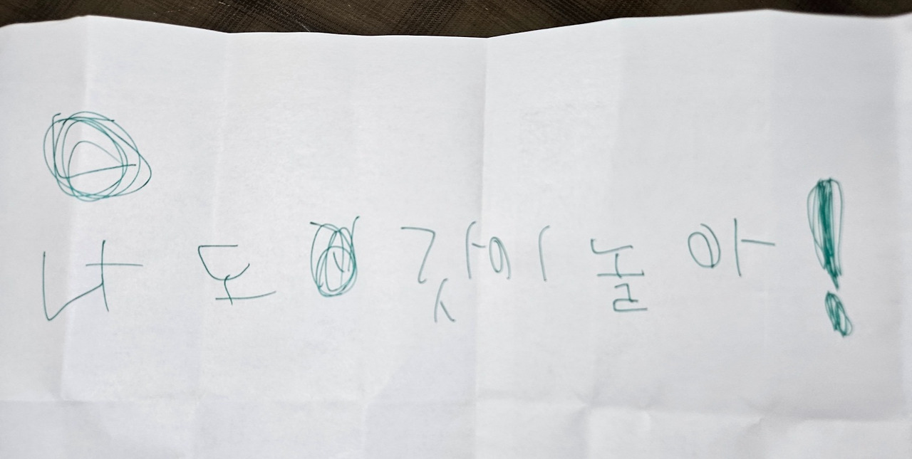 투명하게 드러나는 쪽지 위의 화남체는, 방문 아래 틈으로 쪽지를 구겨질까 조심조심 밀어 넣었을 모습과 대조를 이루며 극한의 사랑스러움으로 엄마를 무장 해제시켰다. 난 이번에는 함박웃음을 숨기지 않았다. 1호가 나와 똑 닮은꼴로 마주 웃는다.