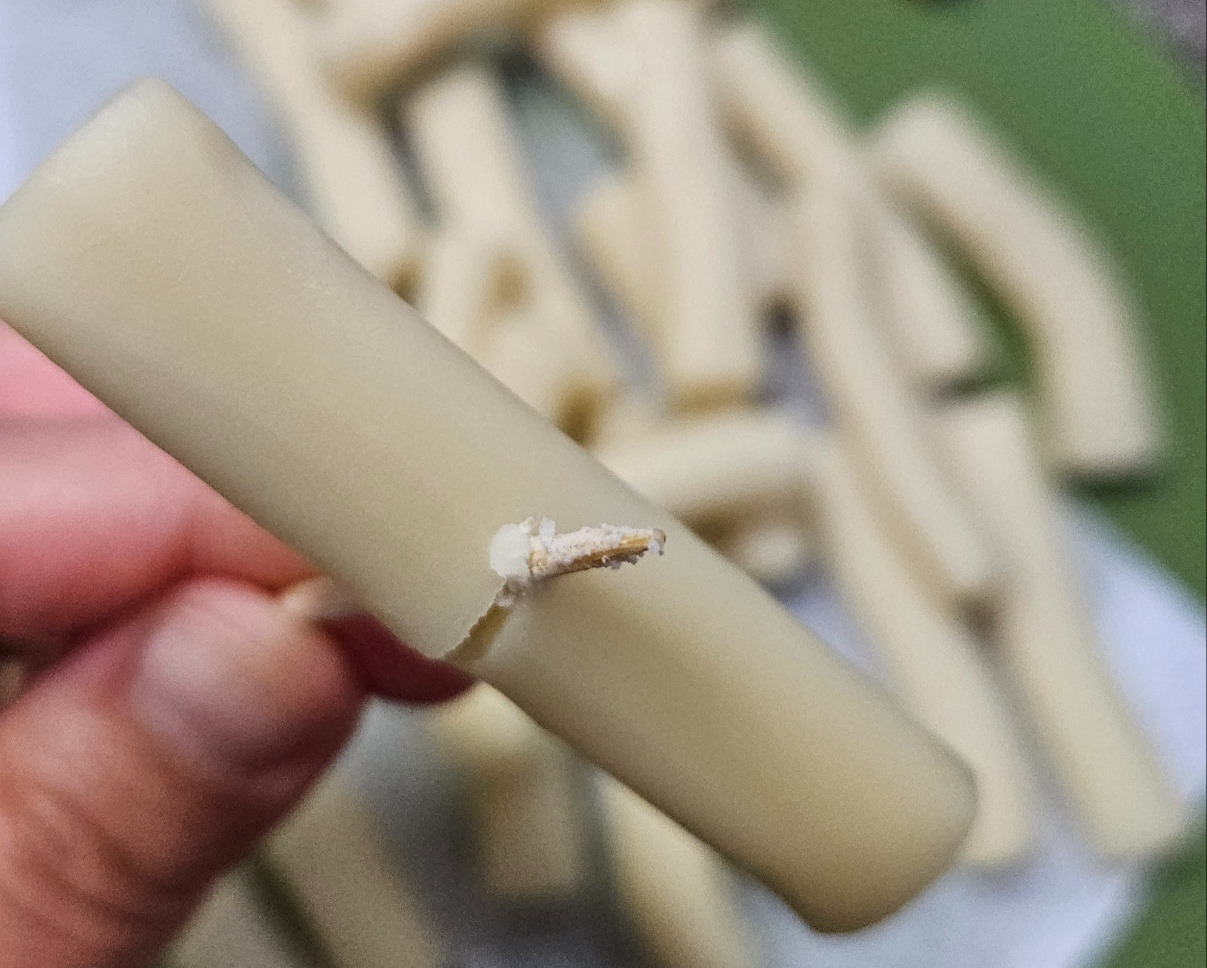 어라? 나무꼬치를 꽂으니 떡이 쩍 갈라진다. 이런. 이번엔 다른 떡을 들고 살살~ 꽂아본다. 살살 갈라지네.