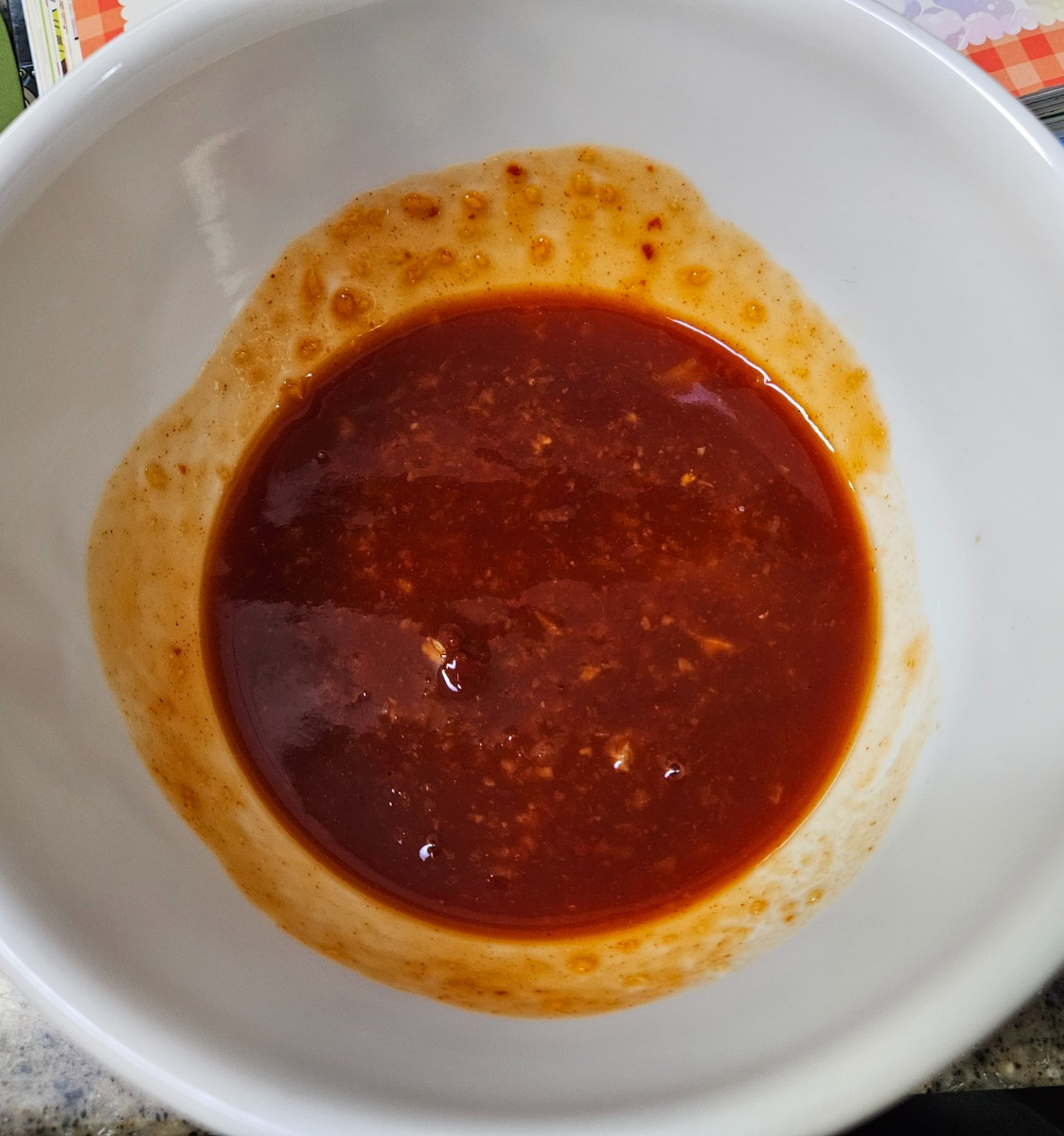 양념소스 만들기 : 고추장과 다진 마늘, 진간장 반 스푼, 설탕 한 스푼, 물엿과 케첩 두 스푼, 물 세 스푼