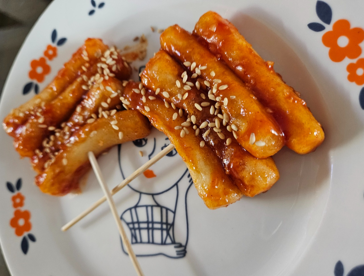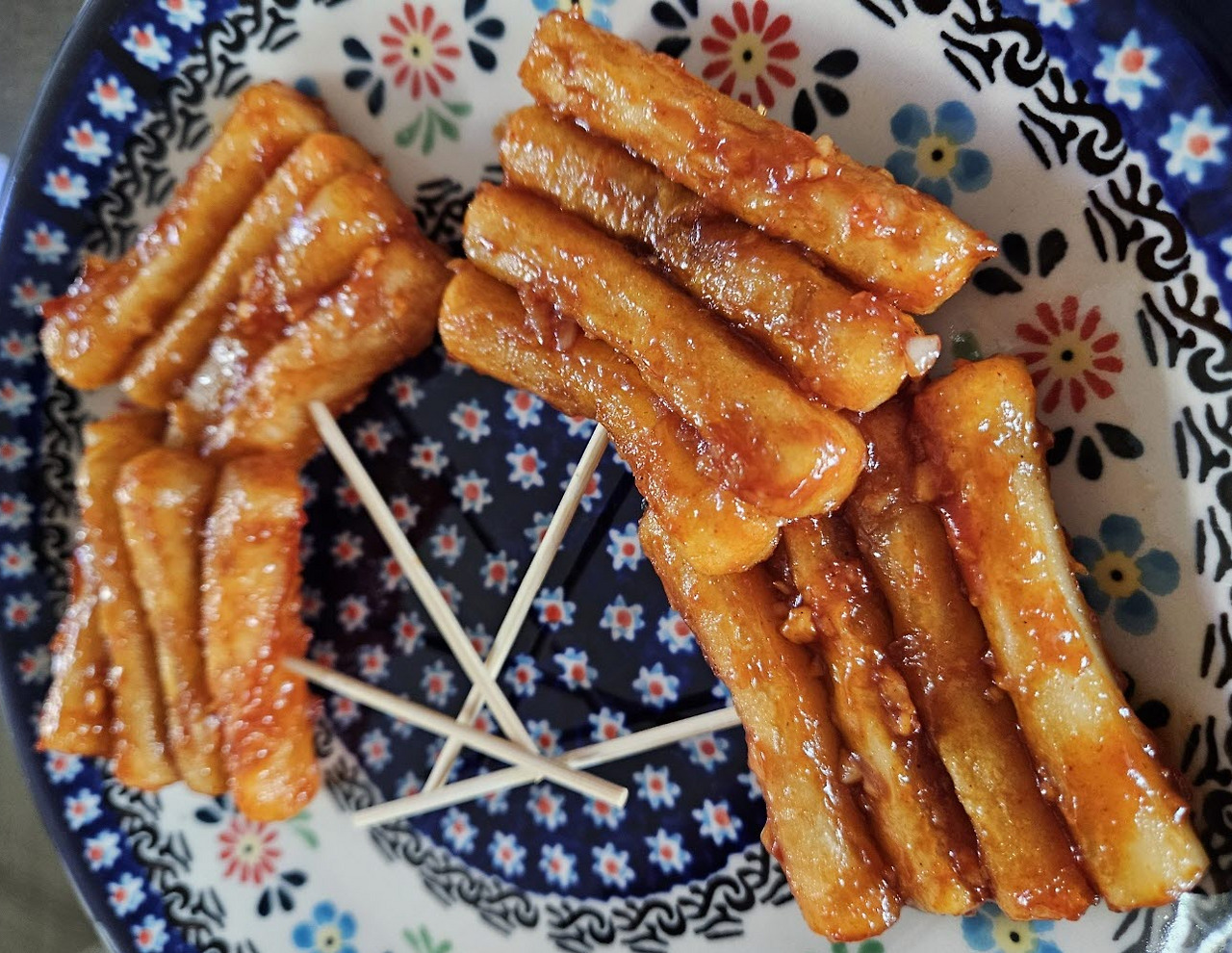 꼬치를 끼우지 않고 조리한 후, 양념을 골고루 입은 떡에 나무 꼬치꼬치를 하나씩 꽂아준 게 신의 한 수였다, 고 자평한다.