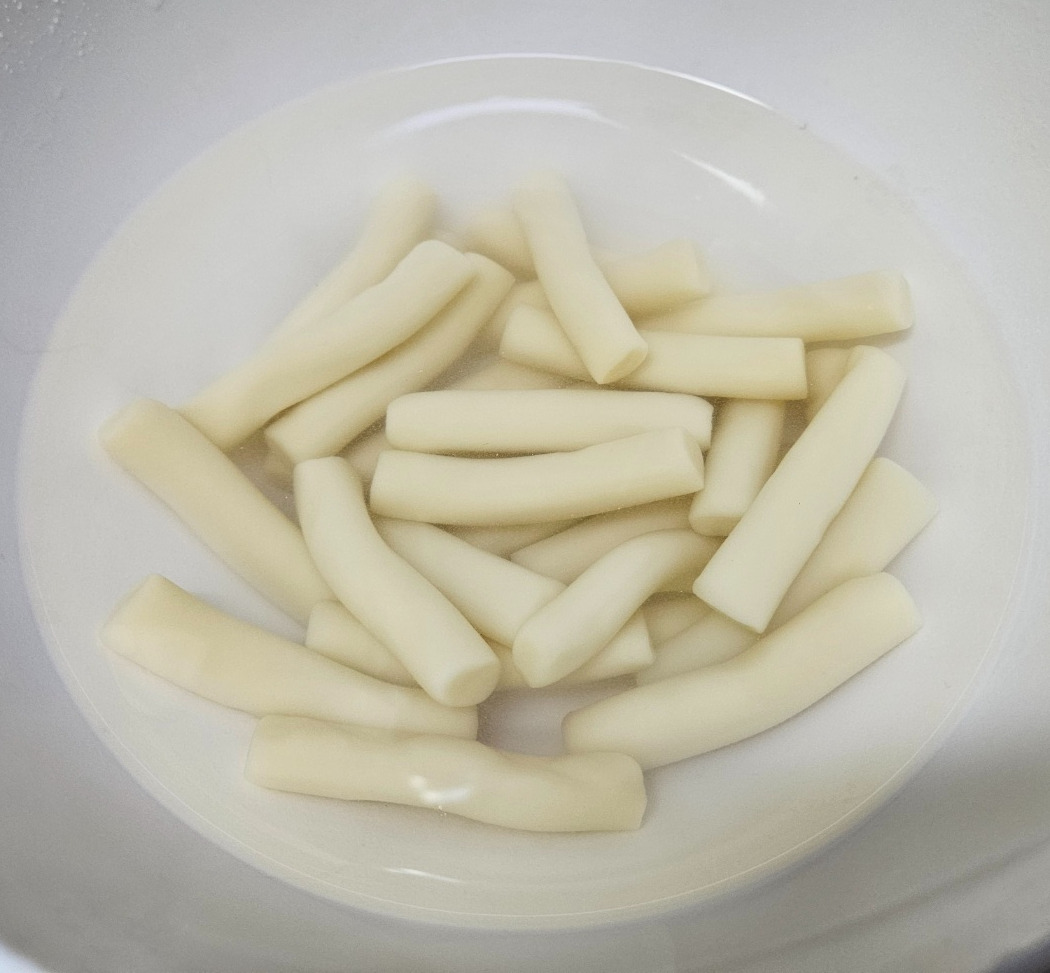 찬물에 10분 불린다. 키친타올로 물기를 닦는다. 떡을 나무꼬치에 꽂는다.