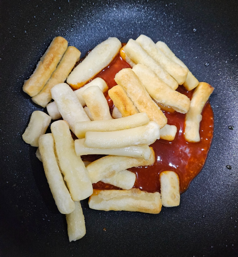아까 그 팬에 양념소스를 중불에 끓인 후 불을 끈다. 대기했던 구운 떡을 넣고 골고루 섞는다.
