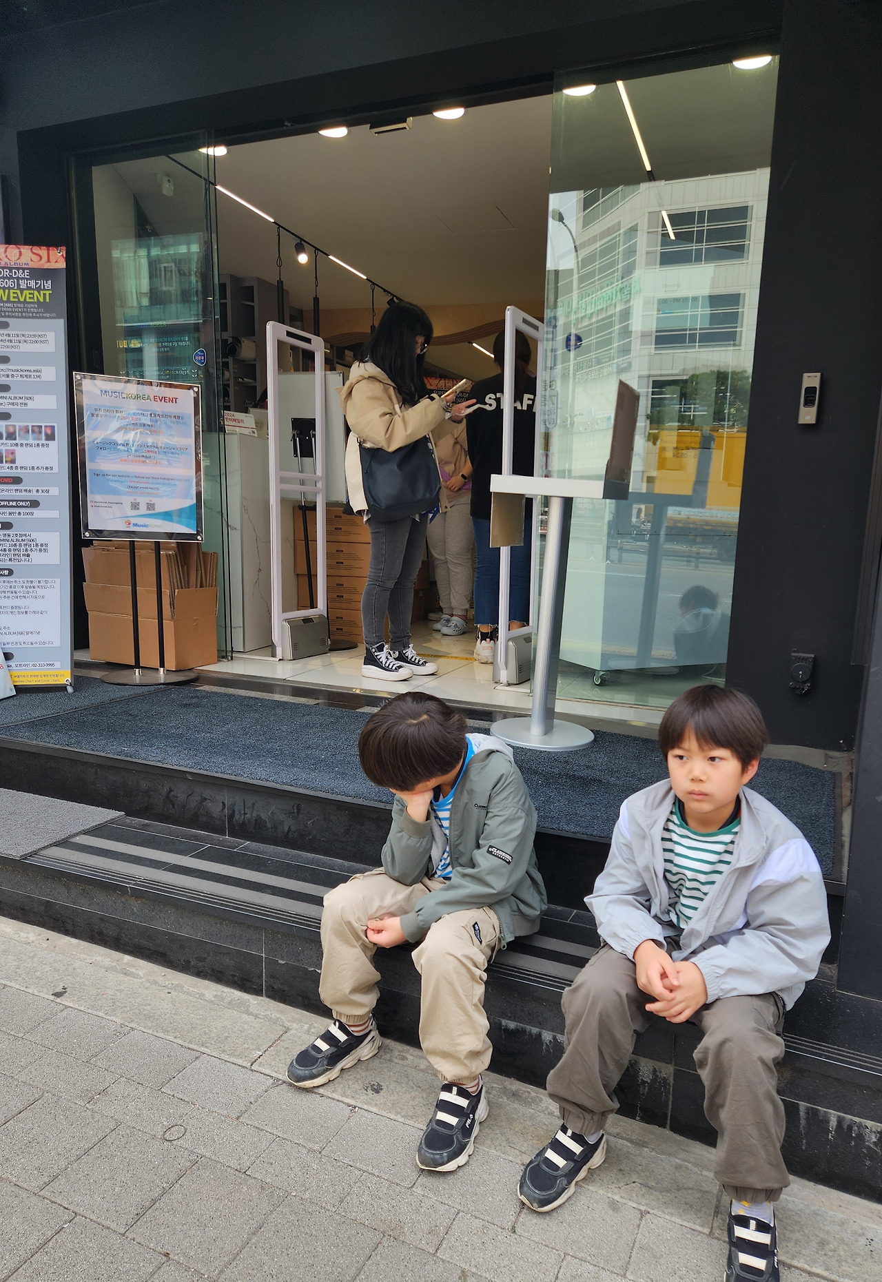 지지난주 서울여행 중. K-POP 매장에서 정신 못차리는 엄마와 누나. 그녀들을 기다리는 두 동생.