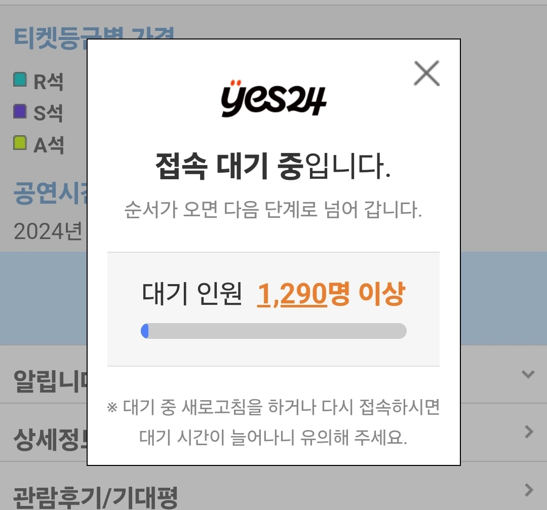 앞뒤 숫자가 모두 바뀌며 10:00가 표시되는 찰나, 그와 동시에 바뀐 빨간색 줄의 '예매하기' 버튼을 눌렀다. 숨을 멈춘다. 화면이 다음으로 시원하게 넘어가지 않은 상태에서 '접속 대기 중입니다.'라는 창이 떴다. 아. 이것 역시 예상하던 바다.