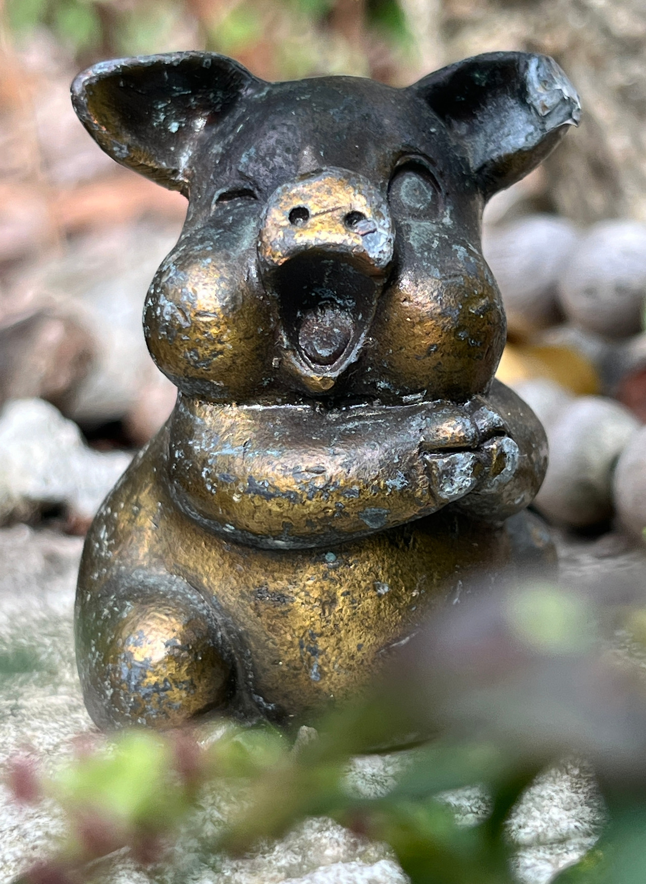 남편은 돼지 조각상이 아내를 닮았다고 놀리면서 폰으로 사진을 찍는다