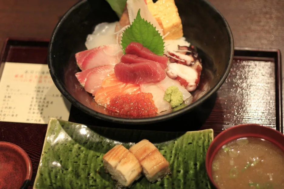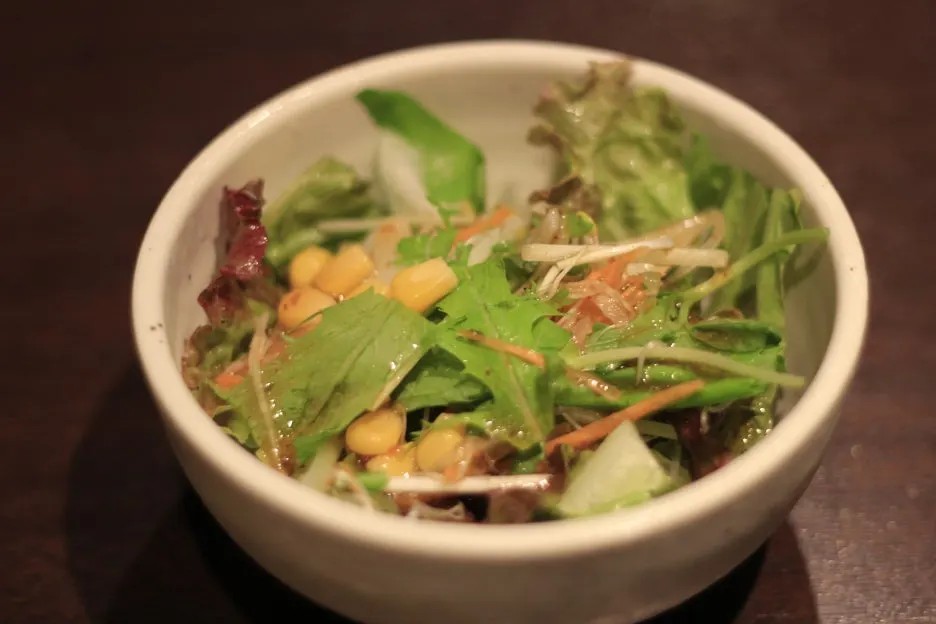 만나자마자 이별을 하고 나니 어느새 아사쿠사에 도착했다. 호텔로 가는 도중 음식집이 보여 가게로 들어가려는 사람에게 물어봤다. 이곳 음식 맛있나요?? 당연히 맛집이라고 먹어보라 했다. 그래서 원래 먹으려고 계획했던 장어덮밥을 뒤로하고 들어갔다. 직원에게 추천 메뉴를 물어보았고, 직원이 추천한 해물 덮밥(카이센 동)을 주문했다. 먼저 샐러드가 나오고 카이센동이 나왔다.