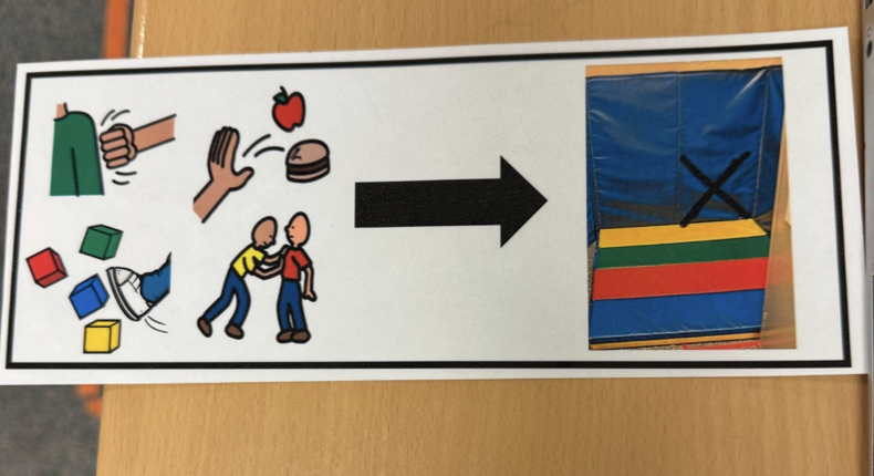 휘두르는 아이를 격리시키거나 결박하지 않고, 교실 수준에서 가능한 위기 중재다. 학생이 도전행동을 보였을 때 즉시 교실 내에서 진정할 수 있는 구조이며, 신체적 개입 없이도 안전 확보를 가능하게 한다. 블루룸/격리방으로 보내기 전, 스스로 조절을 회복할 수 있는 마지막 기회인 것이다.