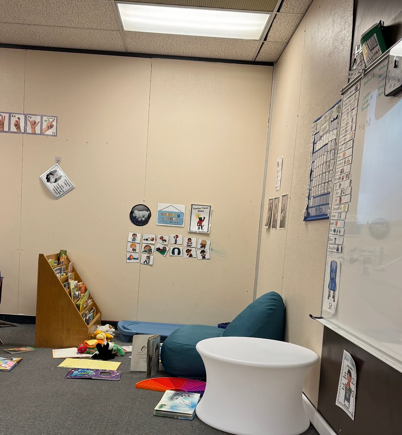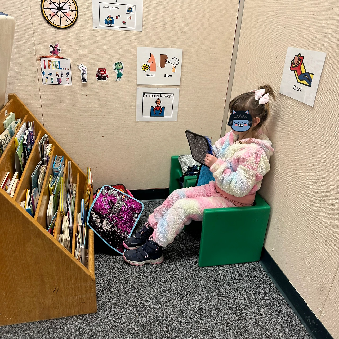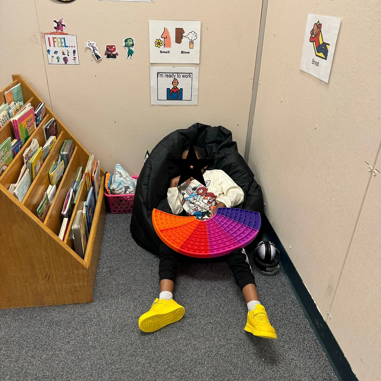 가끔 내 윗세대에 속한 일부 대체교사(sub teacher)나 보조교사(sub para)가 오면, 카밍 코너를 오해해 도전 행동을 보이는 아이를 “타임아웃”시키듯 데려가는 실수를 하곤 한다. 이미 벌어진 일이고, 아이 앞에서 그 어른을 당장 지적할 수는 없어, 나는 놀란 얼굴로 상황을 바라보며 침묵의 시위처럼 눈빛으로 항의한다. 하지만 내 표정을 읽지 못하고, 내가 아이의 태도 때문에 화가 난 것으로 오해하거나, 자신이 뭔가 잘못했다고 눈치 챈 선생님과 보조교사들은 “얘가 이렇게 저렇게 했기 때문에 타임아웃을 시켰어요!”라고 당당히 말하곤 한다.