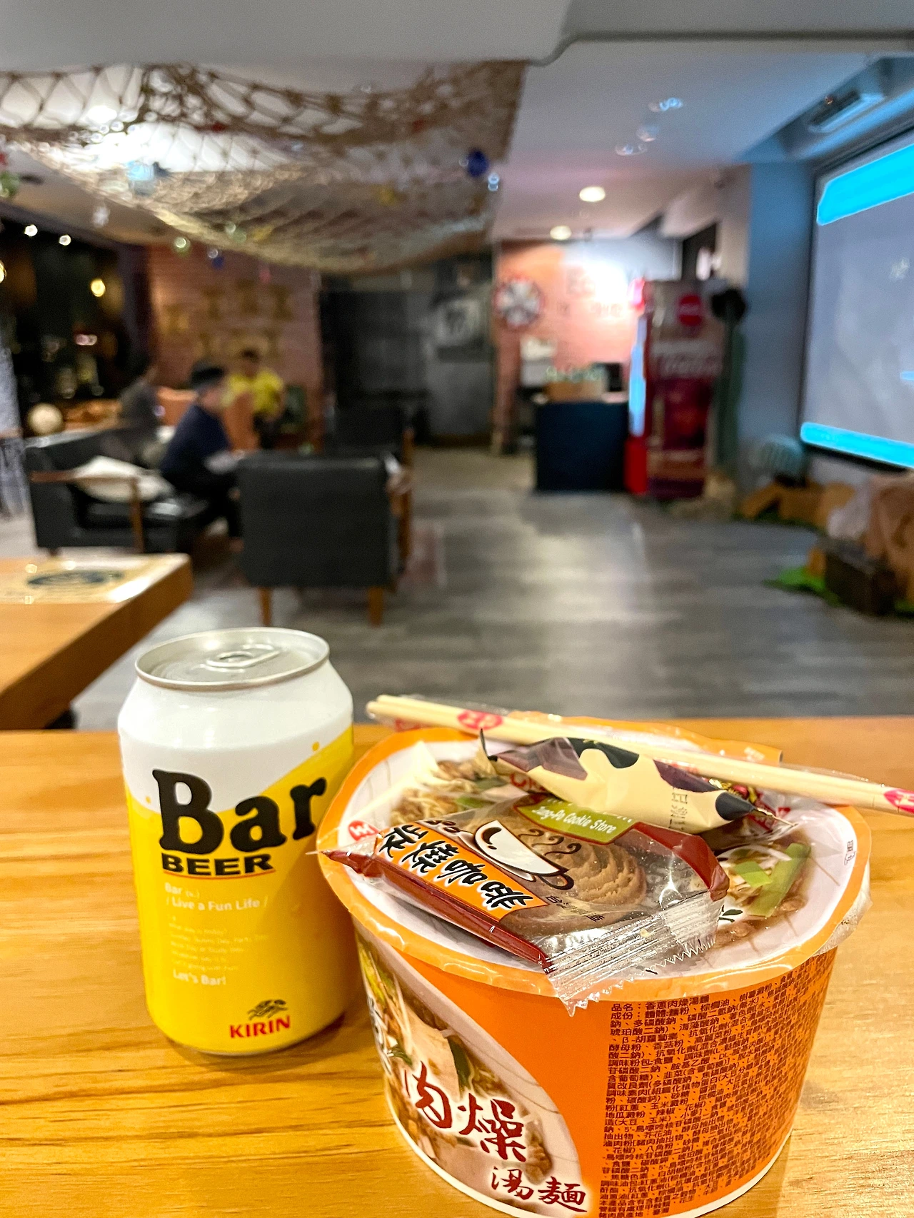 호텔 체크인을 얼른 하고 밖으로 나가 야식 거리라도 사 먹을 계획이었다. 방 키를 주며 안내 사항을 친절하게 알려주던 직원은 "저기 스낵바는 24시간 오픈되어 있고 콜라와 간식, 라면 모두 무료로 먹을 수 있다"라고 알려주었다. 순간 내가 잘못 들었나해서 직원이 가리키는 방향을 보는데 대형 스크린 화면이 설치되어 있고 그 앞에 쇼파, 다양한 형태의 테이블이 놓여 있었다. 쇼파에 편히 앉아 영상을 보거나 내일 여행 계획을 짜며 라면을 먹는 게스트들이 보였다. 물론, 그 곳에 쌓여있는 컵라면과 간식, 콜라 등은 방에 들고 가서 먹어서는 안된다. 별도 조식 서비스가 없는 대신, 24시간 스낵바를 개방하는 구나란 생각이 들었다. 화롄에 오는 사람들 중 일부는 아침 일찍부터 체크아웃하고 트레킹을 떠나는 일이 허다하기 때문에 조식을 없애고 24시간 스낵바를 제공함으로써 나름 호텔 서비스의 구색을 맞추는 느낌이랄까.