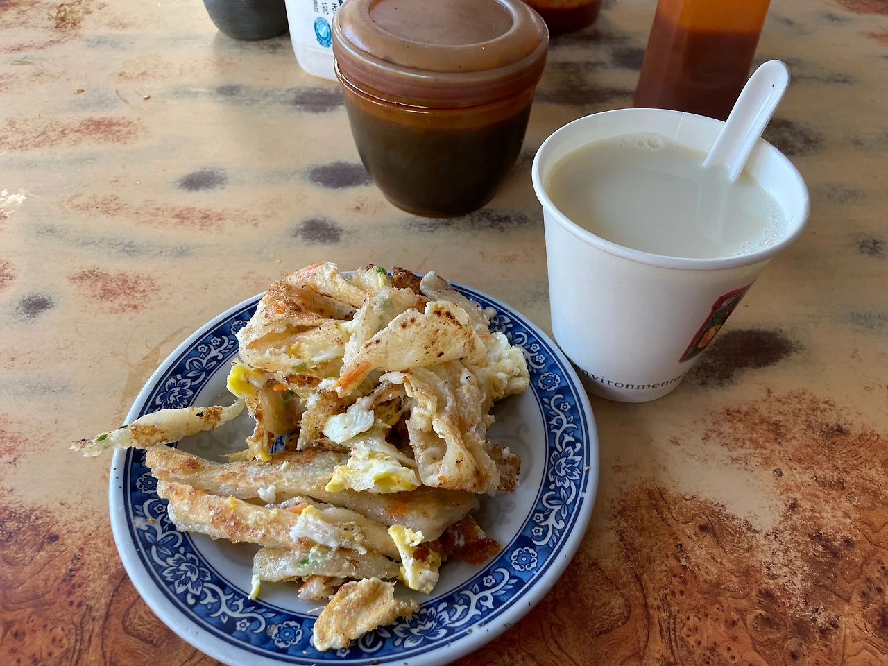 지진에 놀란 가슴으로 잠들었음에도, 아침 7시가 되니 "아침밥" 생각이 간절했다. 마치 어제 지진은 꿈이 아니었을까? 하는 착각이 들어 폰을 확인하니 지진 경보 메시지가 한 차례 더 와있었다. 어제 지진 진동이 한 번 더 있었긴 했나보군. 별 대수롭지 않게 여기고, 대강 씻은 후 짐을 싸고 아침밥을 먹기 위해 나섰다. 도보 5분 거리 내에 있는 아침 식당에서 딴빙(蛋饼 계란전)과 따뜻한 또우쟝(豆浆 콩물, 두유)을 먹는데 만족스럽다.
