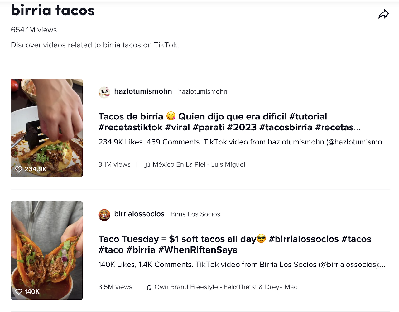 2021년, 미국 구글 검색 트렌드 1위 한 음식은 '비리아 타코(Birria Taco, Taco de Birria)'였다. '음식' 부문에서 검색어 1위를 했다는 건데, 우리에겐 다소 낯선 이 비리아 타코는 틱톡에서 비리아 타코를 국물에 찍어먹는 쇼트 클립 영상으로 센세이션을 일으켰고, 미국 전역에 비리아 타코 노점상이 '우리나라 로제 떡볶이 열풍 급'으로 생겨나며 돌풍을 일으켰다.