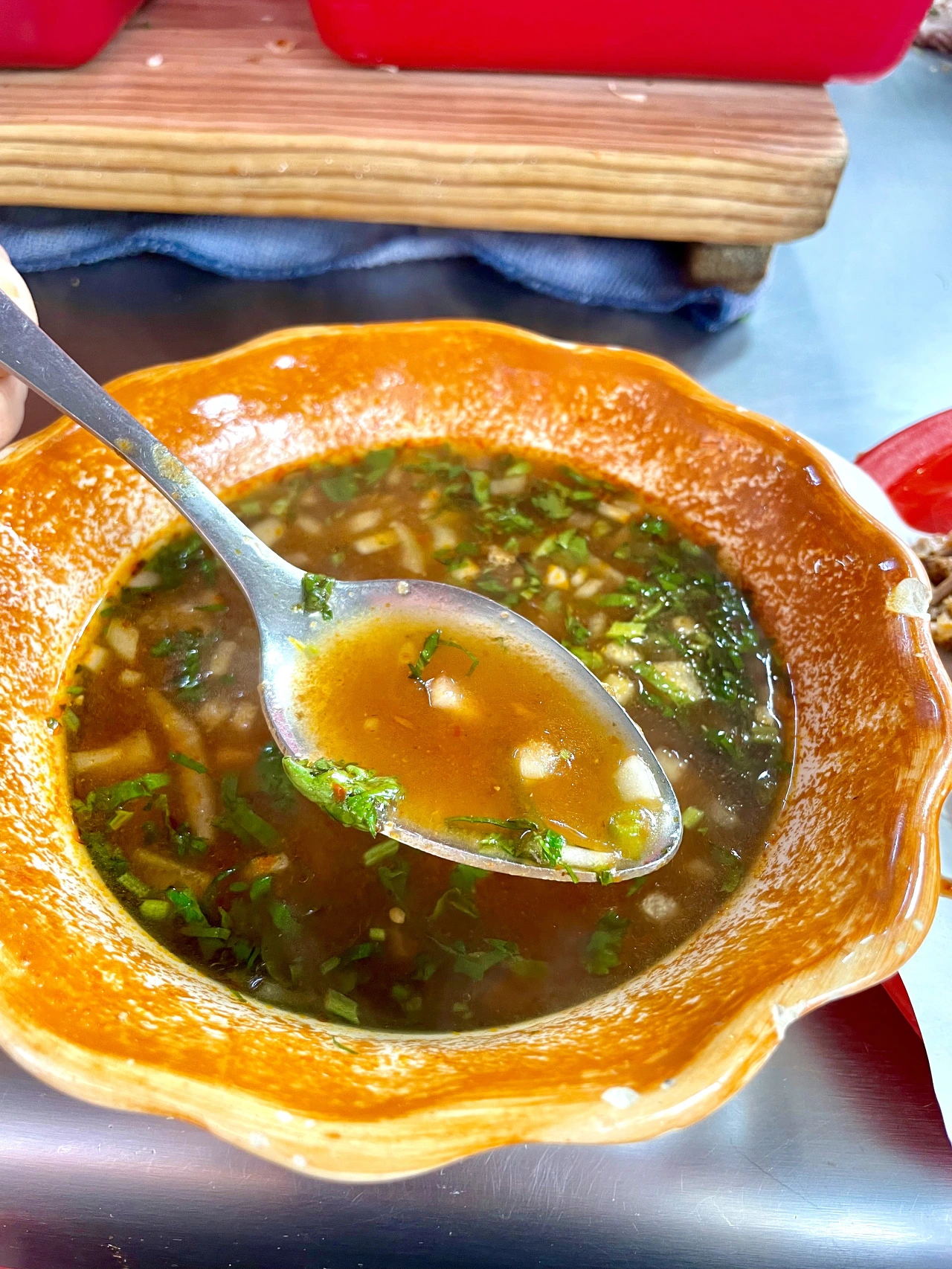 빈자리가 없어 메뉴판을 보면서 잠시 머뭇거리고 있는데 마침내 앞에 있는 아저씨가 다 먹고 일어섰다. 메뉴판엔 '비리아 타코 3개 주문 시 콘소메 수프를 무료 제공'한다는 말이 적혀 있었다. 원래는 타코를 1개씩 주문해 먹어본 후 맛있는 타코를 추가 주문하는 편인데, 무료로 제공한다는 저 달콤한 유혹(?)에 한 번에 비리아 타코 3개를 주문했다.