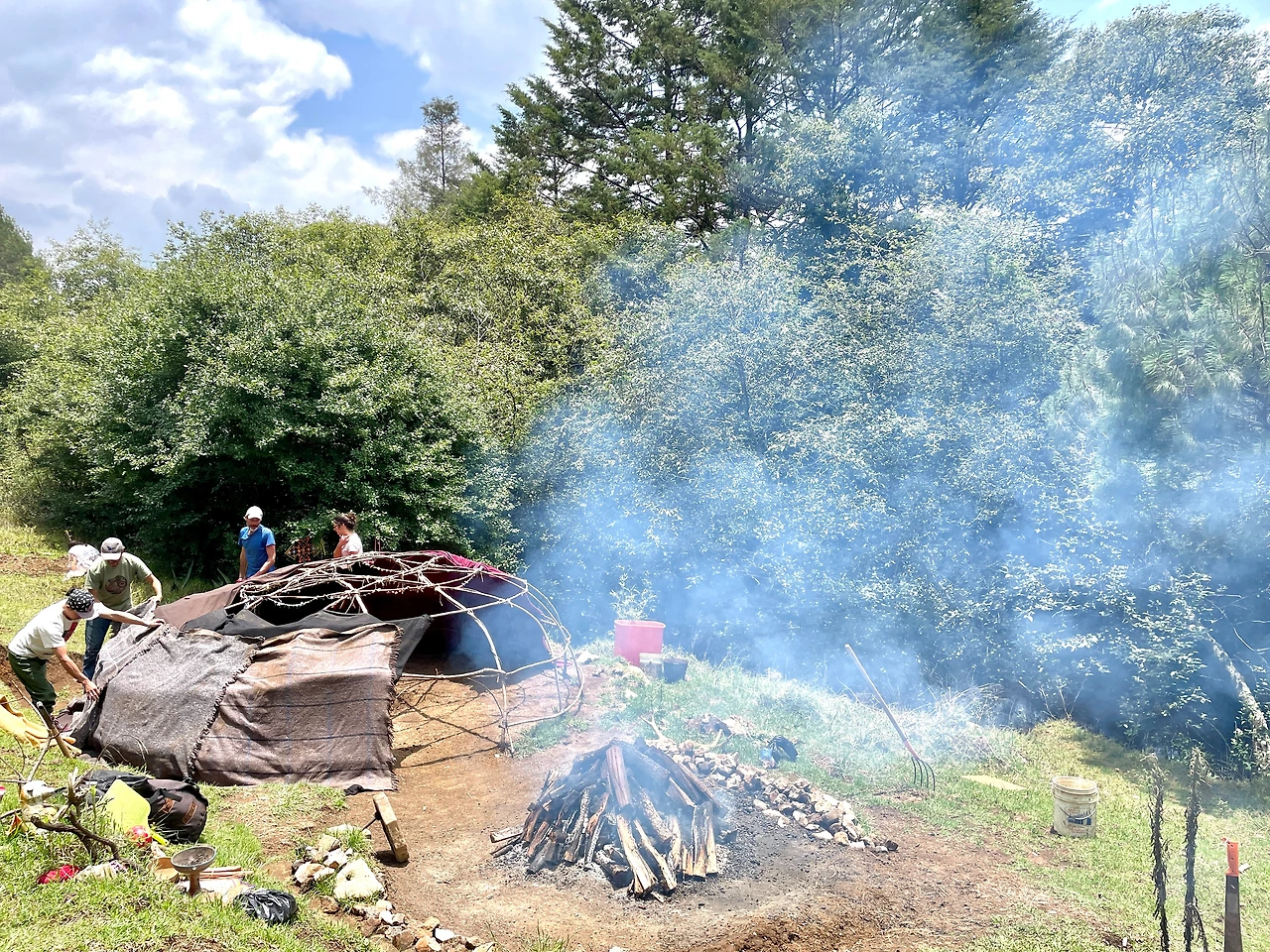 처음엔 우리나라 한증막 수준일 거라 생각하고 꽤 자신만만했다. 뭐 한증막 정도면 2시간 힘들 수 있지만 그래도 못 버틸 정도는 아니라고 생각했다. 앞에서 불을 때는 것을 구경하다가 돔 위에 매우 두터운 담요를 올리는 것을 도왔다. 전통적으론 화산암이나 각종 진흙으로 빚은 벽돌 등으로 만든 이글루 형태로 존재했지만 스페인군 침입으로 당시 대부분 떼마스칼 흔적은 모두 파괴되었다고 한다.