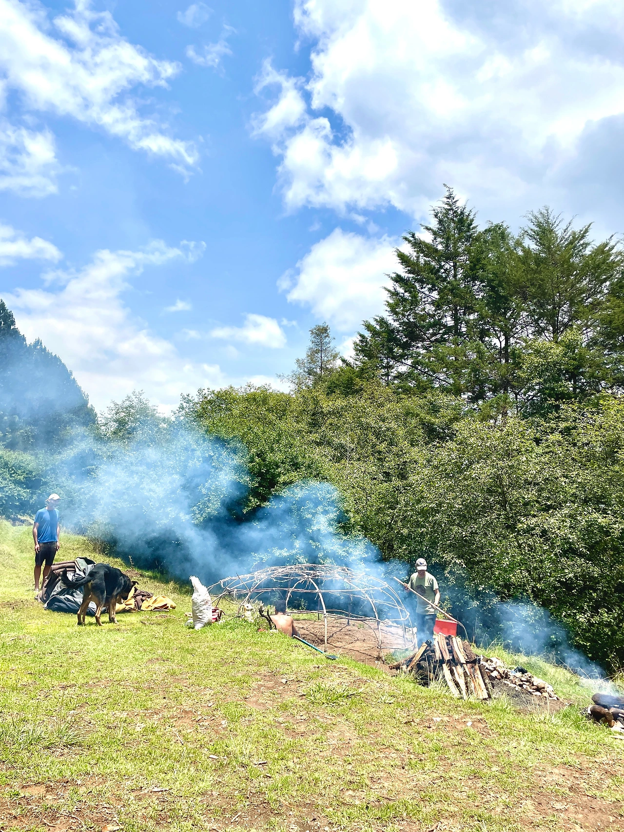 11시 20분쯤 도착했는데 임의로 만든 계단을 따라 내려가니 멀리 나뭇가지 대로 돔 형태로 만든 구조물이 보였고 그 앞에서 불을 때고 있었다. 웃동을 벗은 한 남자는 떼마스칼에 온 걸 환영한다며 돔 형태로 만든 구조물의 의미를 설명해 주었다. 우리 앞에 먼저 도착한 사람들은 히피스러운 외모를 물씬 풍기는 스페인 여자와 홍콩 남자였다. 검은색 곱실거리는 긴 머리를 가진 그녀가 팔을 들어 올리니 겨드랑이 털이 수북해 순간 나도 모르게 색계 탕웨이를 떠올렸다. 그녀는 수풀 위에 누워 태양을 쬐고 있었는데 떼마스칼 경험만 한 20번 넘는다고 한다. 그 옆의 홍콩 남자는 산 크리스토발에 산지 1년 정도 됐는데 항상 가야지 가야지 마음만 먹다가 오늘 눈을 떴는데 갑자기 오고 싶단 생각이 들어 처음 왔다고 소개했다.