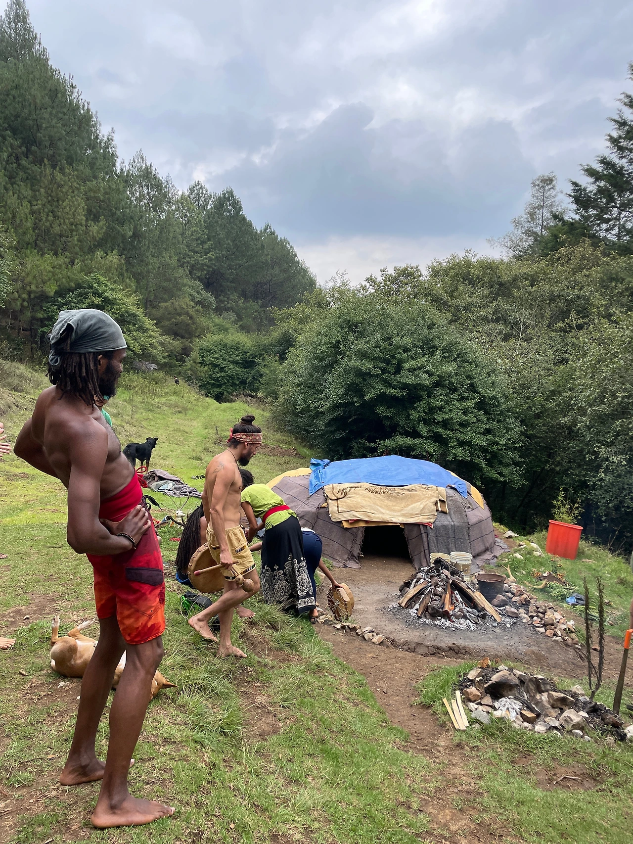자궁이라 불리는 이 돔을 완성하고 불로 돌을 충분히 달구는데 거의 2시간이 걸렸다. 오전 11시 시작한다고 해서 헐레벌떡 도착했는데, 오후 1시 좀 넘으니 점점 사람들이 많아졌다. 대부분 맨발에 웃통을 벗은 상태 거나 여자들은 노브라 위에 얇은 나시를 입은 상태였다.