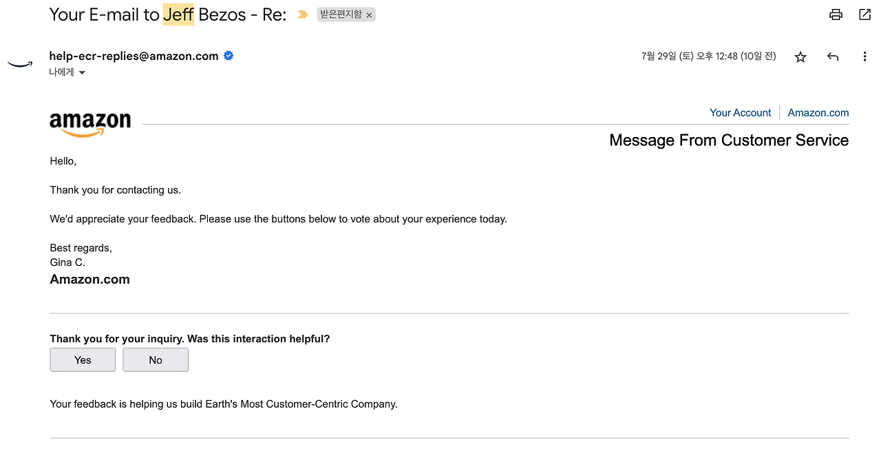 근데 이 개똥 같은 조언도, 정말 절박해지고 더 이상 노답이다 싶을 땐 마치 지푸라기처럼 잡기 마련이었다. 결국 나는 내 메일에 대한 답변이 3일이 넘게 오지 않자 (아마존에선 보통 6시간~24시간 이내 답변을 원칙으로 한다) 사실 관계 확인 및 그동안의 내용 등을 자세하게 서술하고 답변을 기다린다는 내용을 제프 베조스 참조해서 고객센터에 보냈다.