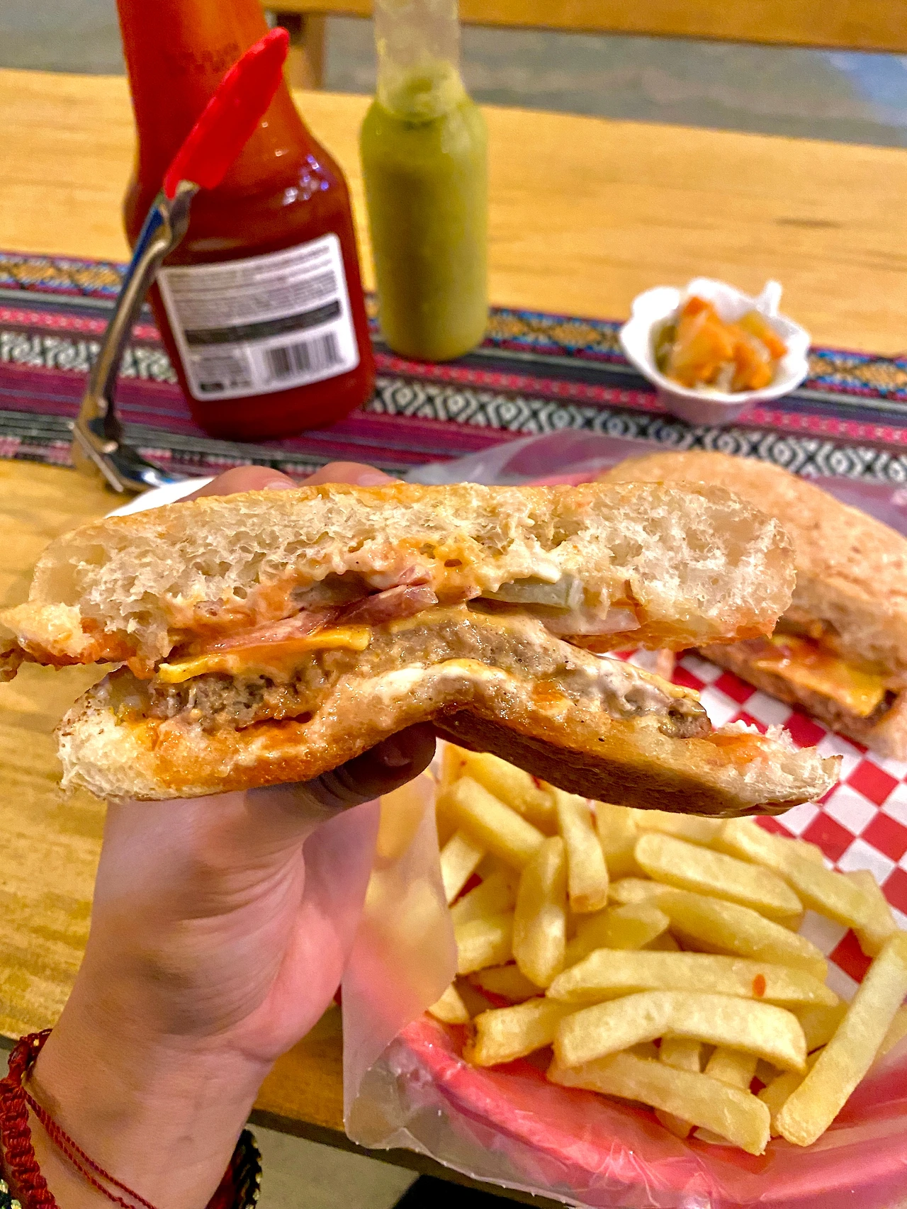 10분 정도 기다리니 테이블엔 케첩과 그린살사소스, 피클류가 차려졌고 빨간 접시에 내가 주문한 버거와 감자튀김이 담겨 나왔다. 햄버거는 가게에서 산 듯한 참깨 번에 소고기, 토마토, 양상추, 치즈 등이 들어가 있었다. 문제는 비비큐 소스와 케첩 중간 형태로 보이는 소스에 이 모든 재료가 잔뜩 절여 나온다는 것이다. 토마토와 양상추 등마저 흐물흐물해질 정도로 소스 범벅인 버거는 일단 내 취향과는 상당히 멀었다. 탕수육 부먹파인 내가 봐도 이건, 조금 아니다 싶었을 정도로. 반면, 감자튀김은 갓 만들어 신선했다.