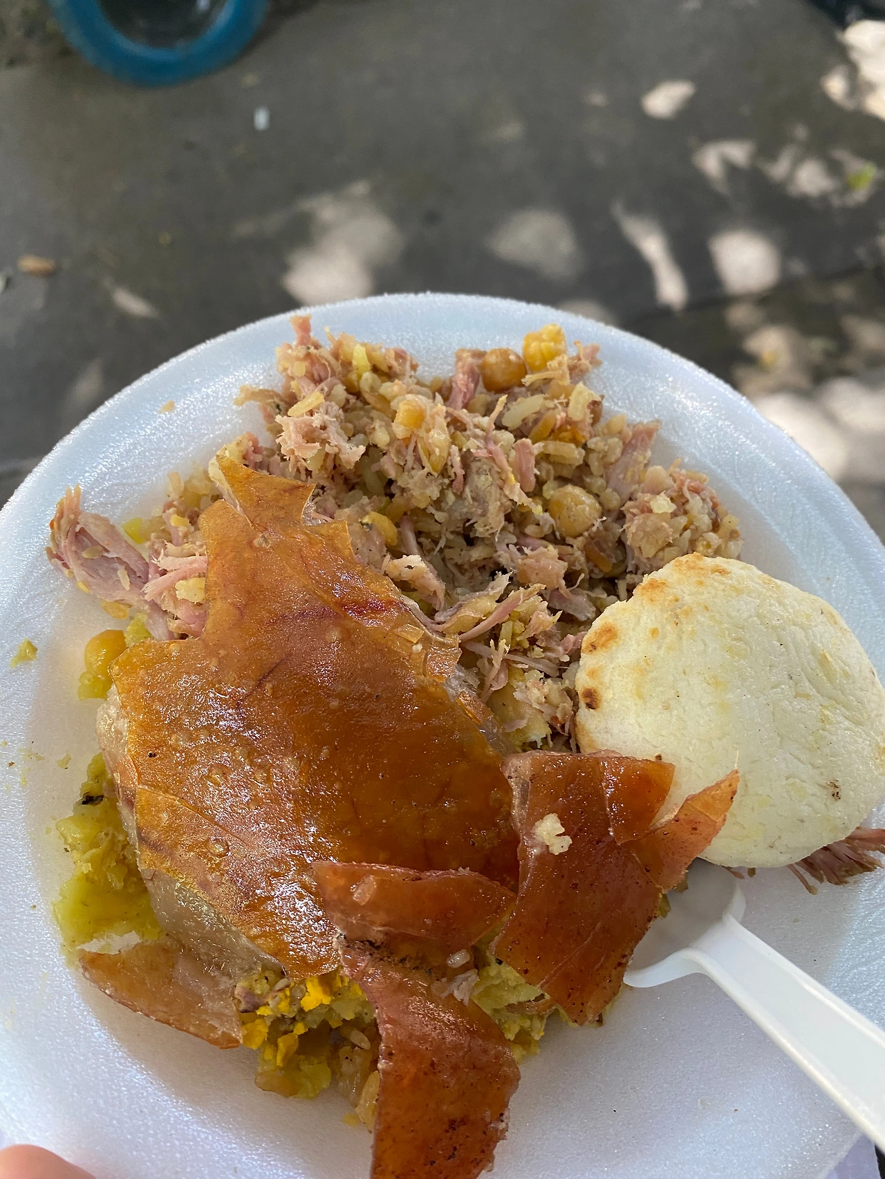 과자처럼 바삭하게 부서지는 돼지껍질을 한 입 베어 물고 일회용 숟가락으로 밥을 퍼먹었다. 간은 기본 소금 간으로만 한 거 같았는데 밥에 돼지고기 향이 잘 베여 있어서 중간중간 씹는 식감을 더해주는 병아리콩도 맛있었다. 내가 지나가는 말로 "이거 집에 포장해서 맥주랑 같이 먹어도 맛있겠어요"라고 하니 아저씨 R은 아주머니에게 포장용으로 1인분 하나 더 주문했다.