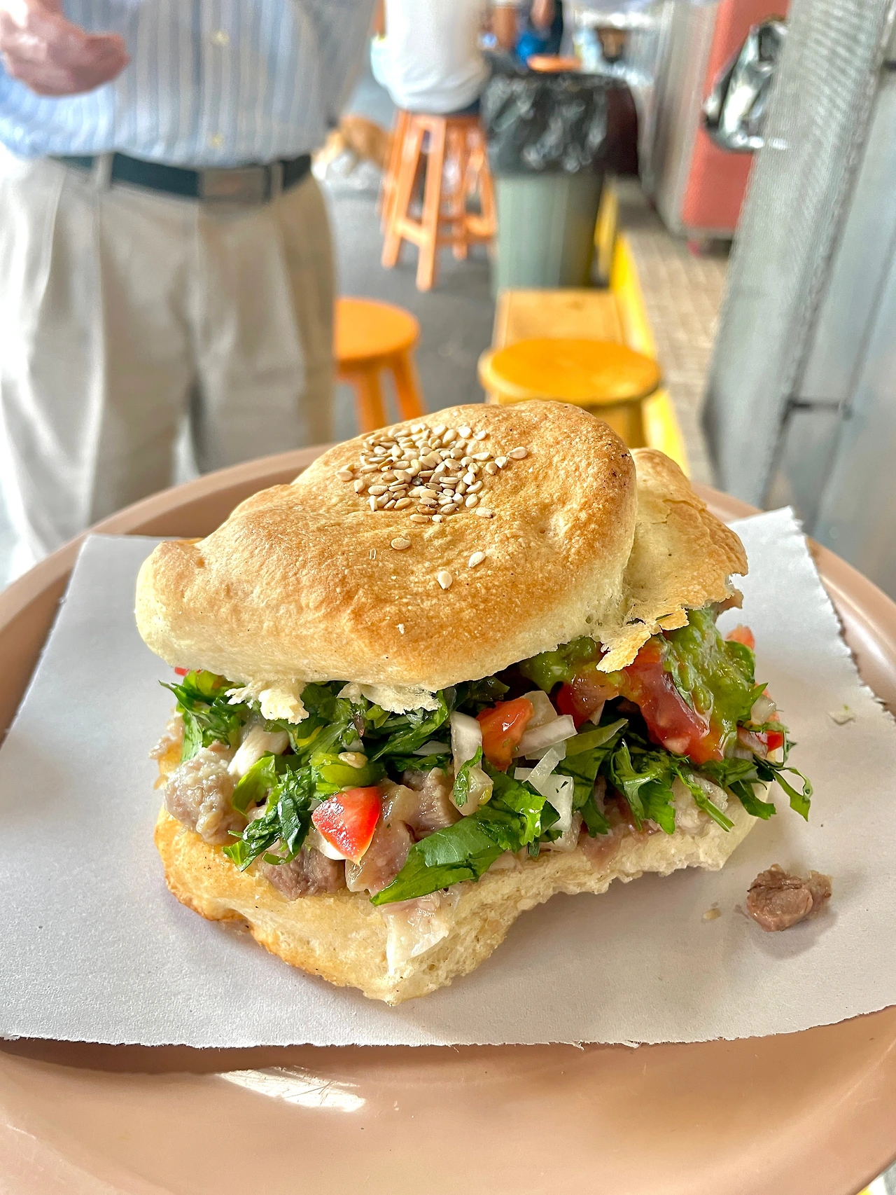 촐룰라 피라미드 하산 후 촐룰라 근처 시장으로 향했다. 아침을 든든하게 먹은 상태라 배는 그리 고프진 않았지만, 푸에블라 시내로 다시 돌아가기 전에 촐룰라 시장에 있는 간단한 먹거리를 맛보고 싶어서 였다. 꽤 작은 규모의 시장이었는데, 지나가다가 한 아이가 들고 먹는 쎄미따가 맛있어 보여 "그거 어디서 살 수 있어?"라고 물으니 쎄미따 노점들이 모여 있는 곳으로 안내했다. 그 중 쎄미따 까베싸(Cemita de cabeza)를 주력하고 있는 한 노점이 눈에 들어왔다. 까베싸는 뇌, 머리를 뜻하는데 여기선 머릿고기라고 할 수 있겠다.