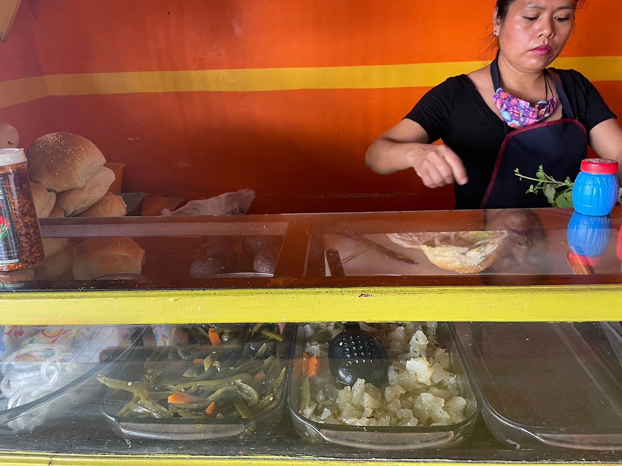 안에 들어갈 고기 종류를 정하고, 재료를 하나씩 가리키며 넣을것인지, 매운 소스를 넣을 것인지 등을 물었다. 일단 모든 재료를 다 넣어달라고 요청했는데, 얇게 양념된 돼지고기에, 오이절임(피클과 유사함), 아보카도, 잎채소와 얇게 찢은 치즈를 잔뜩 넣어준다. 맥도날드의 햄버거보다 저렴한 가격으로, 혜자스러운 푸에블라식 버거를 맛볼 수 있는 것은 큰 기쁨이었다. 무엇보다 소스가 달지 않고, 매콤하고 속재료 하나하나가 신선해 나름 건강한 아침식사라는 점이 마음에 들었다. 음식 인심 좋은 멕시코 답게 크기도 보통 버거보다 1.5배크고 푸짐하다.