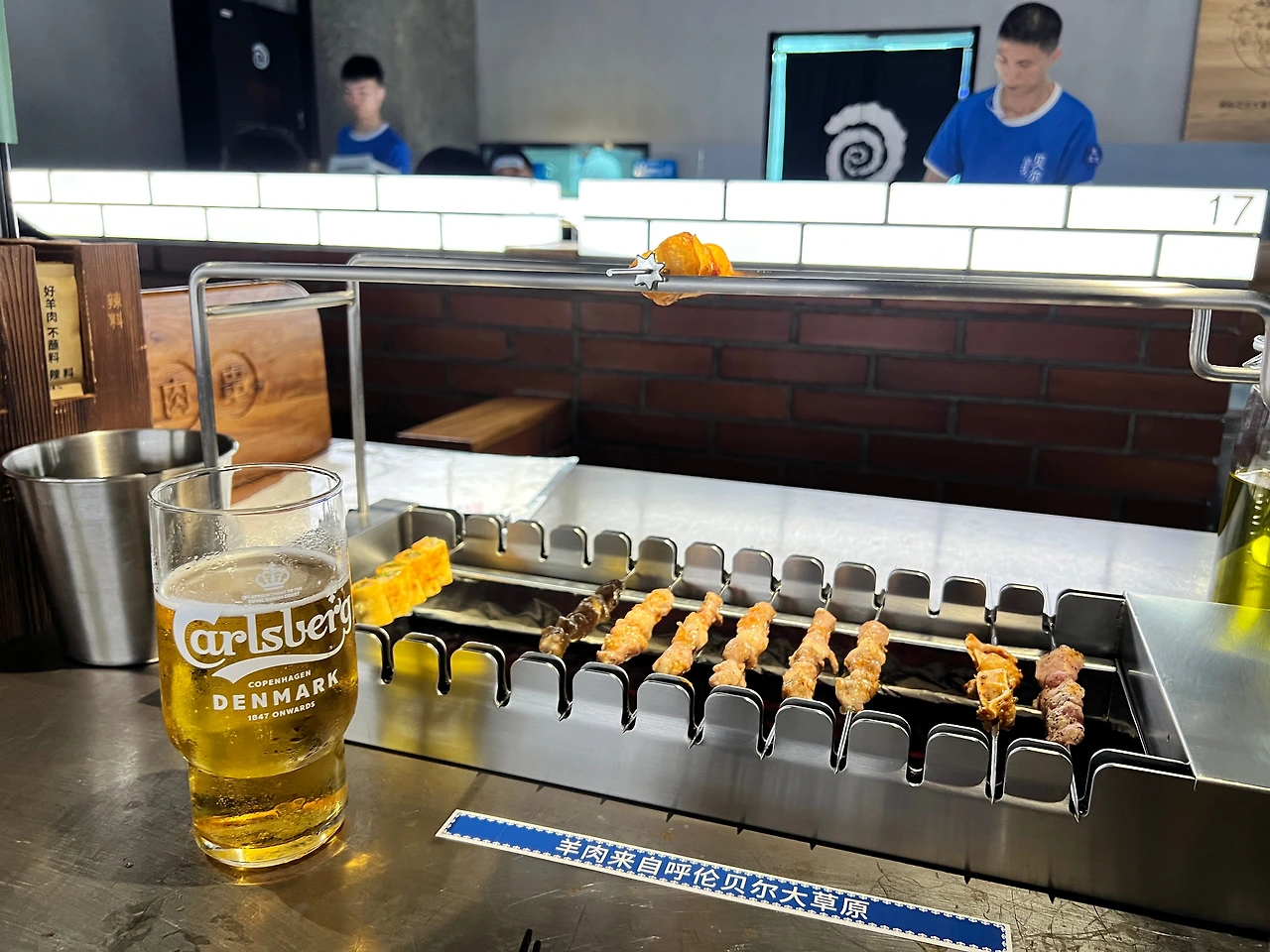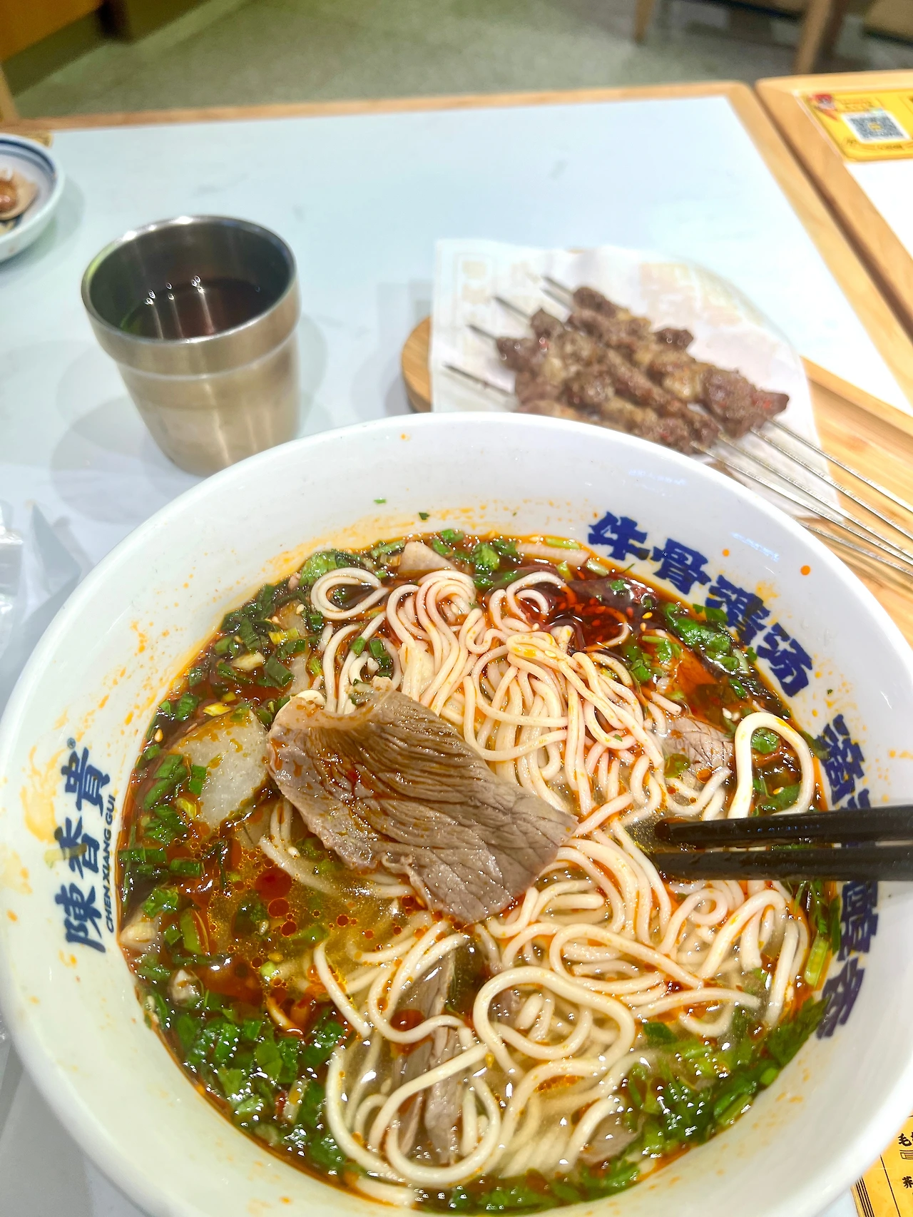 이날도 상하이 외곽에 위치한 아름다운 서점을 구경하고 이른 저녁을 먹기 위해 쇼핑센터를 돌아다니다가 발견한 우육면집. 이 집 시그니처인 소 사골을 끓인 담백한 우육면이란 문구보다 2번째로 많이 팔린다는 양꼬치가 눈에 들어왔다. 주방에서 구워 나오는 양꼬치 5개와 우육면 세트가 한화로 약 1만 2천 원 정도로 가성비 세트였는데 나처럼 혼자지만 이것저것 먹어보고 싶은 사람들에게 제격이었다.