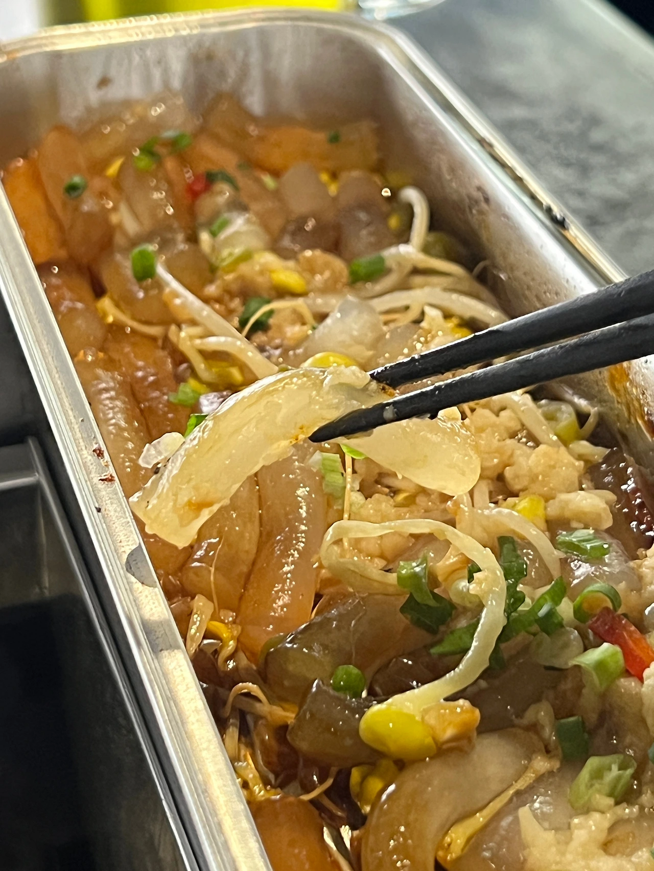 이곳에는 독특하게 흑설탕떡볶이(红糖年糕)가 있어서 주문해 보았는데, 일단 생각보다 너무나 많은 떡볶이 양에 놀랐고, 기대이상으로 맛있어서 또 놀랐다. 투명한 분모자에 콩나물과 다진 야채 등을 넣은 간장 베이스 떡볶이였는데 이름만큼 달진 않았다.
