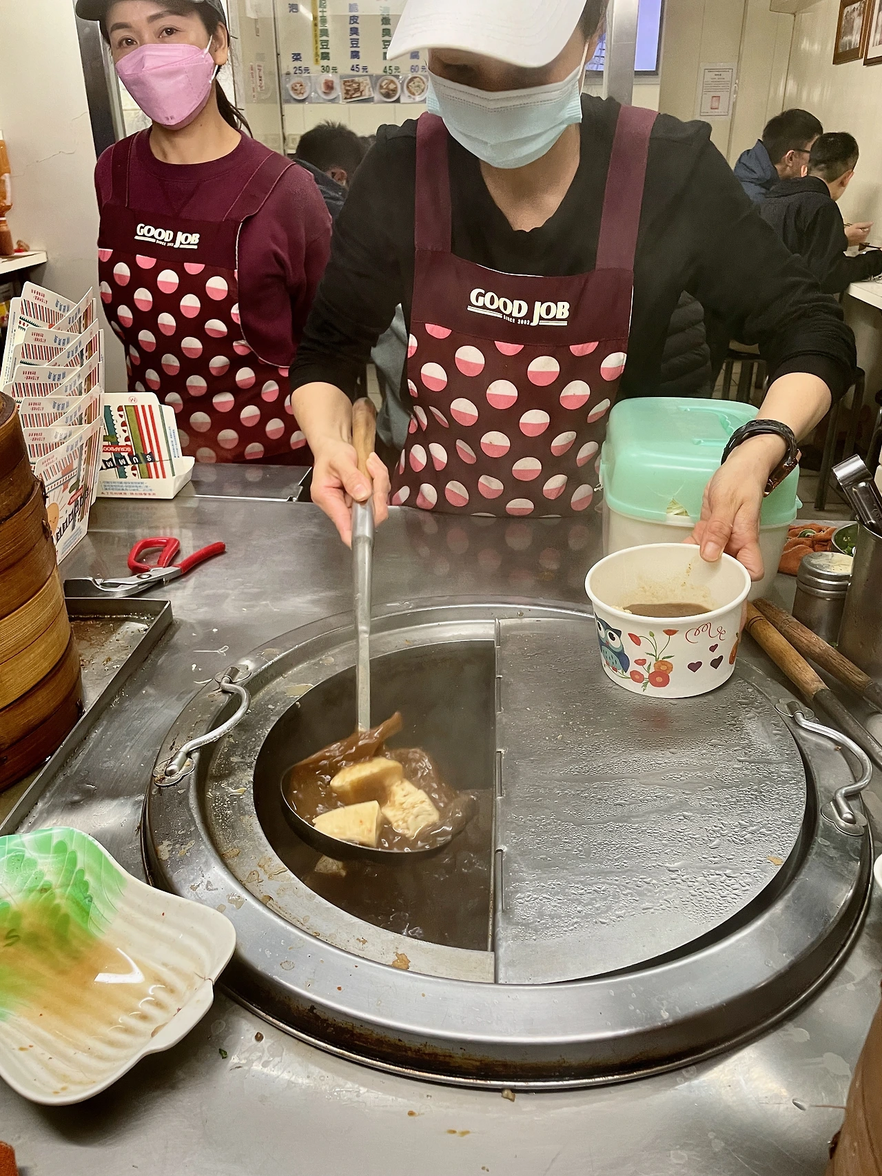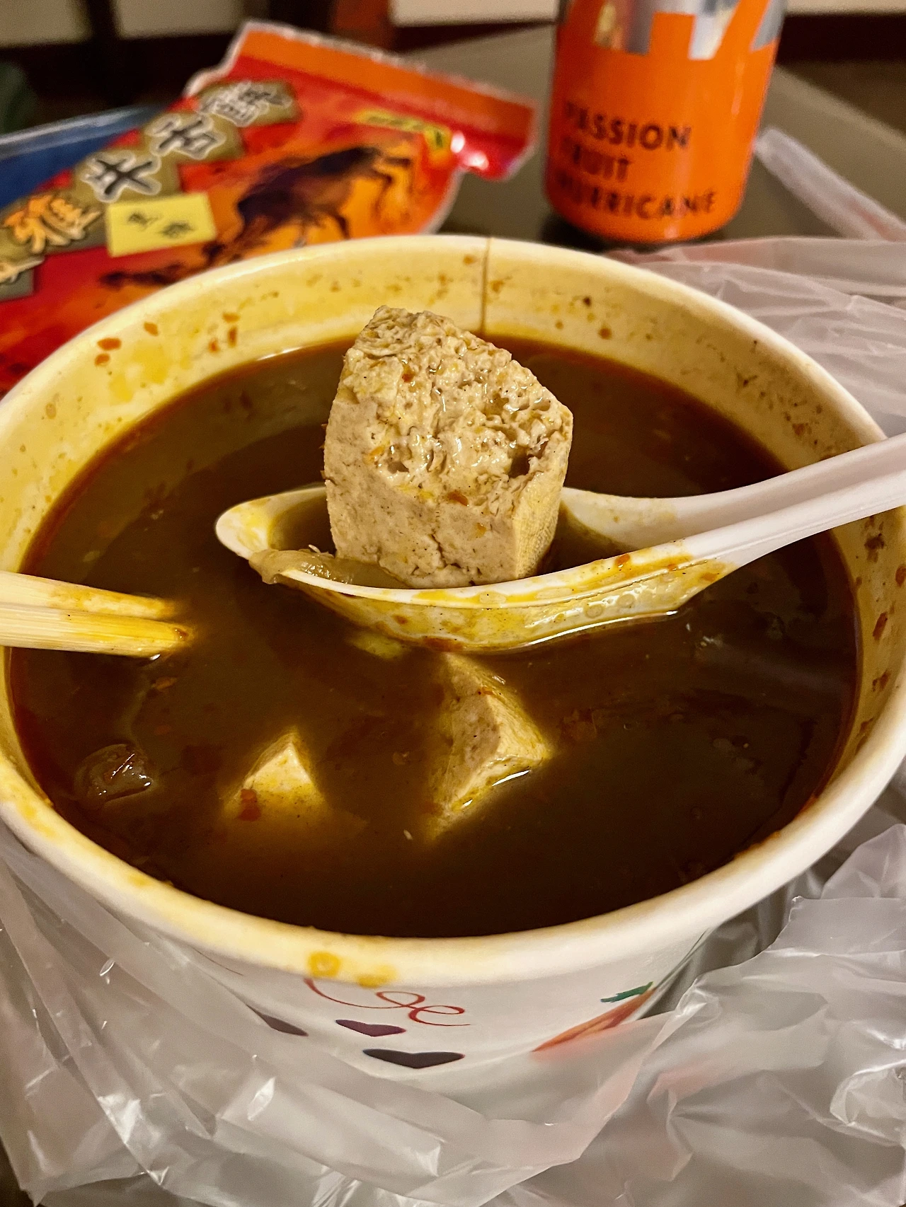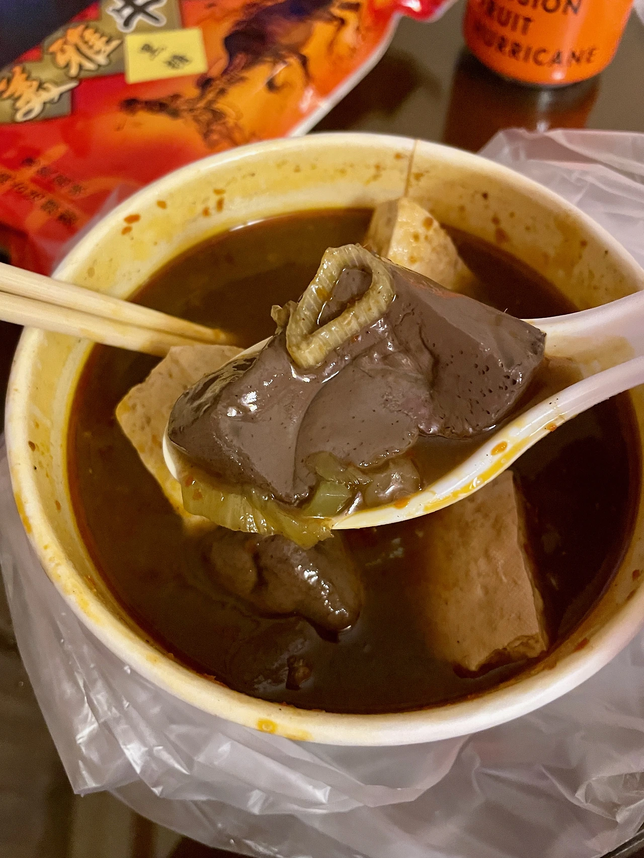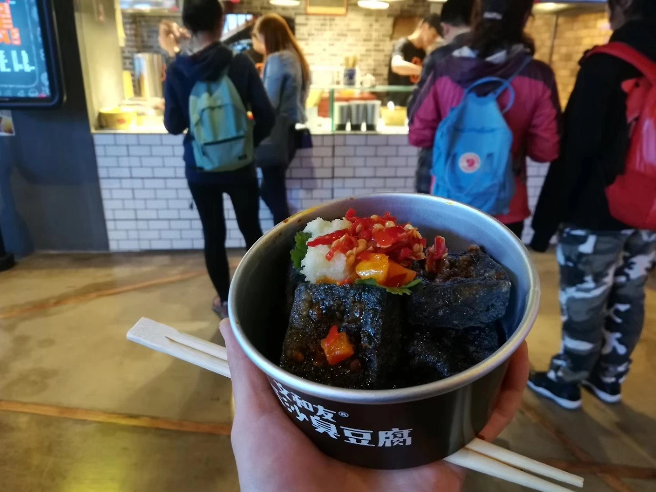 갑자기 숙소에 들어오기 직전에 지나쳤던, 취두부 노점이 눈에 아른거렸다. (취두부는 야식으로 많이 먹어서 보통 밤늦게까지 노점 운영을 하는 경우가 많다) 배불러 죽겠는데, 그 취두부 집이 너무 궁금해서 결국 다시 옷을 갈아입고 뛰쳐나갔다. 이곳은 마침 국물 취두부 위주로 취급하는 곳이었는데, 국물맛이 한 3~4가지 정도 있었다. 마침내 앞의 한 남자가 "전화로 마라 취두부 주문했다"며 픽업하고 있었는데 그 말에 홀려 나도 "마라 취두부 주세요"라고 말했다.