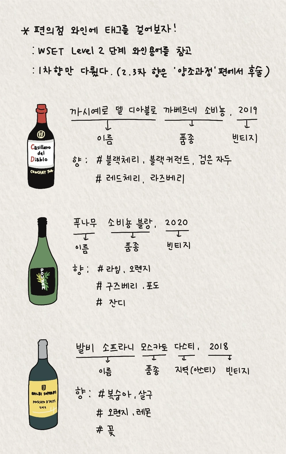 다만 향은 지극히 주관적인 영역이기 때문에 골치가 아프다. 가령 와인을 올리면서 #첫뽀뽀향 이라고 올린다면 해석이 분분할 것이다. (경험에 따라 캔디향, 가글의 민트향, 혹은 마늘 향일 지도.......) 그래서 와인 향 태그 걸기의 첫걸음은 전문가들이 보편적으로 묘사한 단어부터 시작하기를 권한다. 세계적인 와인 교육기관 WSET(Wine & Spirit Education Trust)에서는 아래와 같은 표를 와인 시음의 체계적인 접근법으로 삼고 있기에 참고하시라.