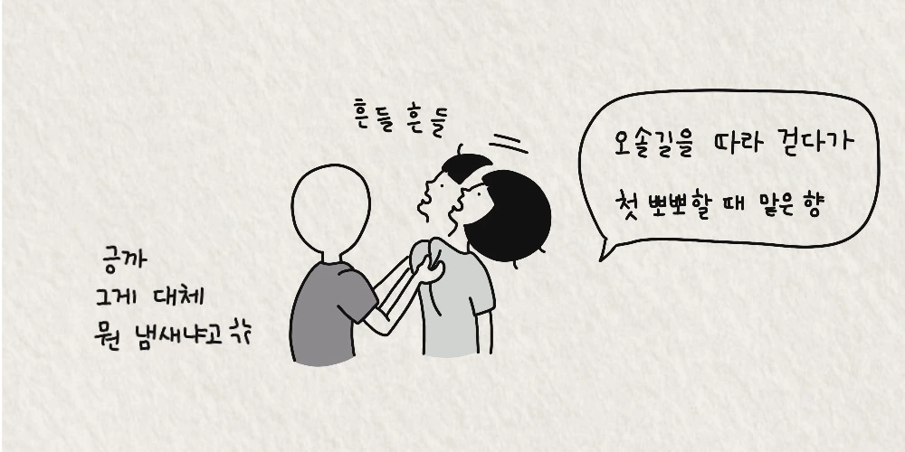 그렇게 어이없는 이유로 하게 된 첫 뽀뽀. 20년이 지난 지금, 그놈 얼굴도 이름도 기억이 나질 않지만 젖은 낙엽 냄새를 맡으면 첫 뽀뽀 생각이 난다.