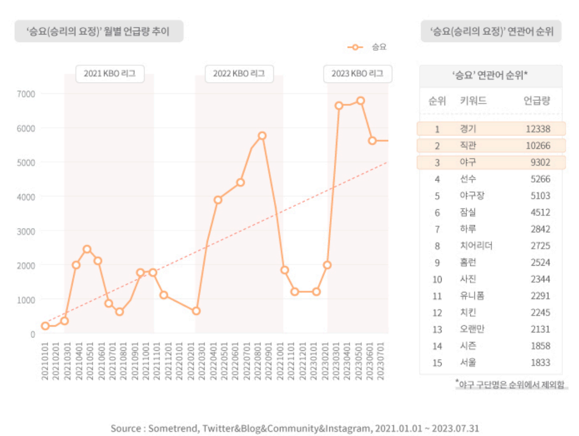 특히 KBO 리그(한국 프로야구 리그)가 진행되는 3월 말부터 10월 말 사이에 ‘승요’의 언급량이 높아진다는 점에서 ‘승요’는 야구 경기 직관과 관련이 높다.