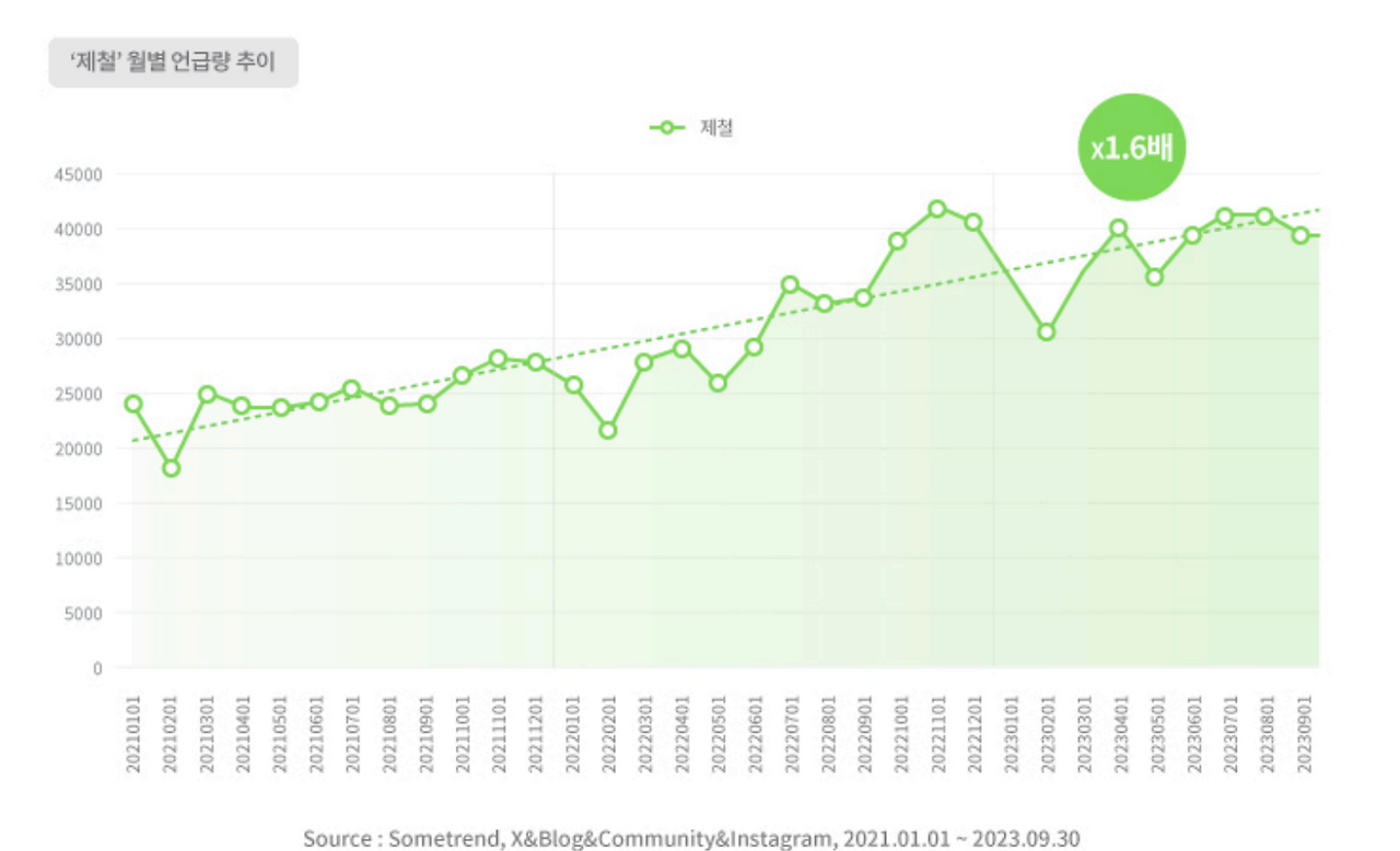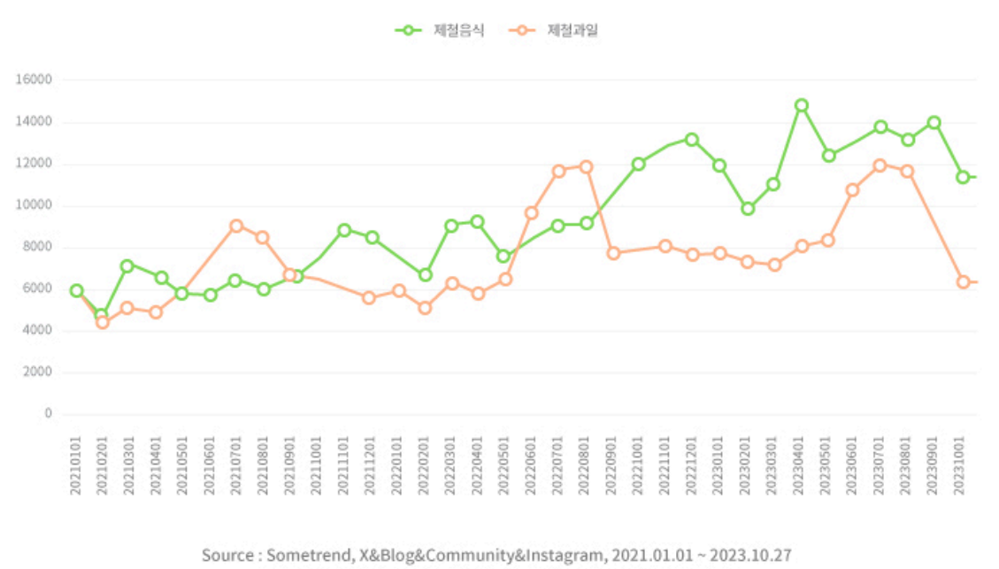 최근 3년 사이 ‘제철’의 언급량은 1.6배 상승했으며, 연말에 가까워질수록 철에 맞는 무언가를 찾는 사람들이 많아지는 추세다.