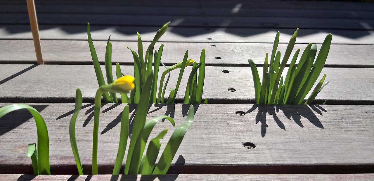 캄캄한 데크 아래에서 자라고 있는 수선화를 구출할 방법은 아무리 생각해도 떠오르지 않습니다. 데크는 바닥과 땅이 거의 맞닿아 있을 정도로 틈이 없었기 때문이죠