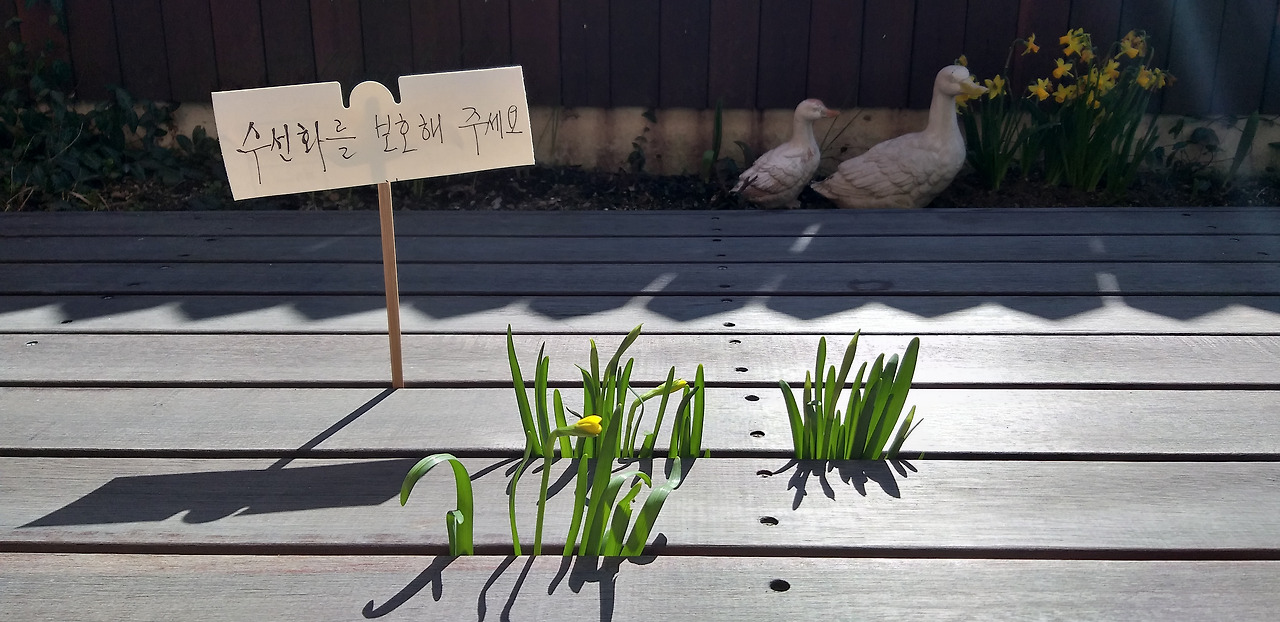 그리고 밤이면 제 집인양 드나드는 고양이가 밟고 지나가지 않도록 데크 위 수선화가 솟아오른 자리에 소쿠리를 덮어 두었습니다. 할머니 집에만 오면 강아지처럼 뛰어다니는 손녀를 조심시키기 위해 '수선화를 보호해 주세요'라고 쓴 팻말도 세워두었습니다.