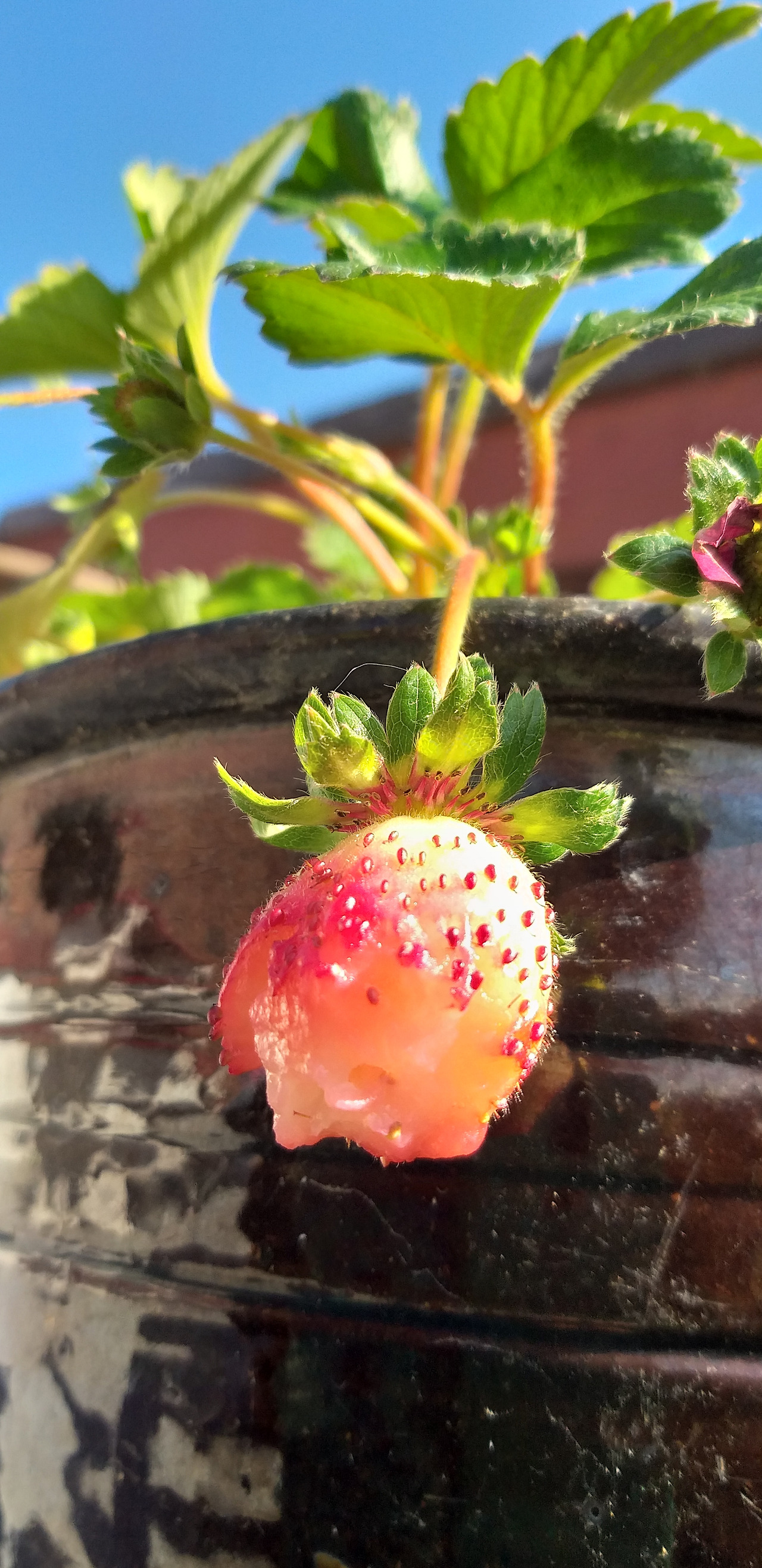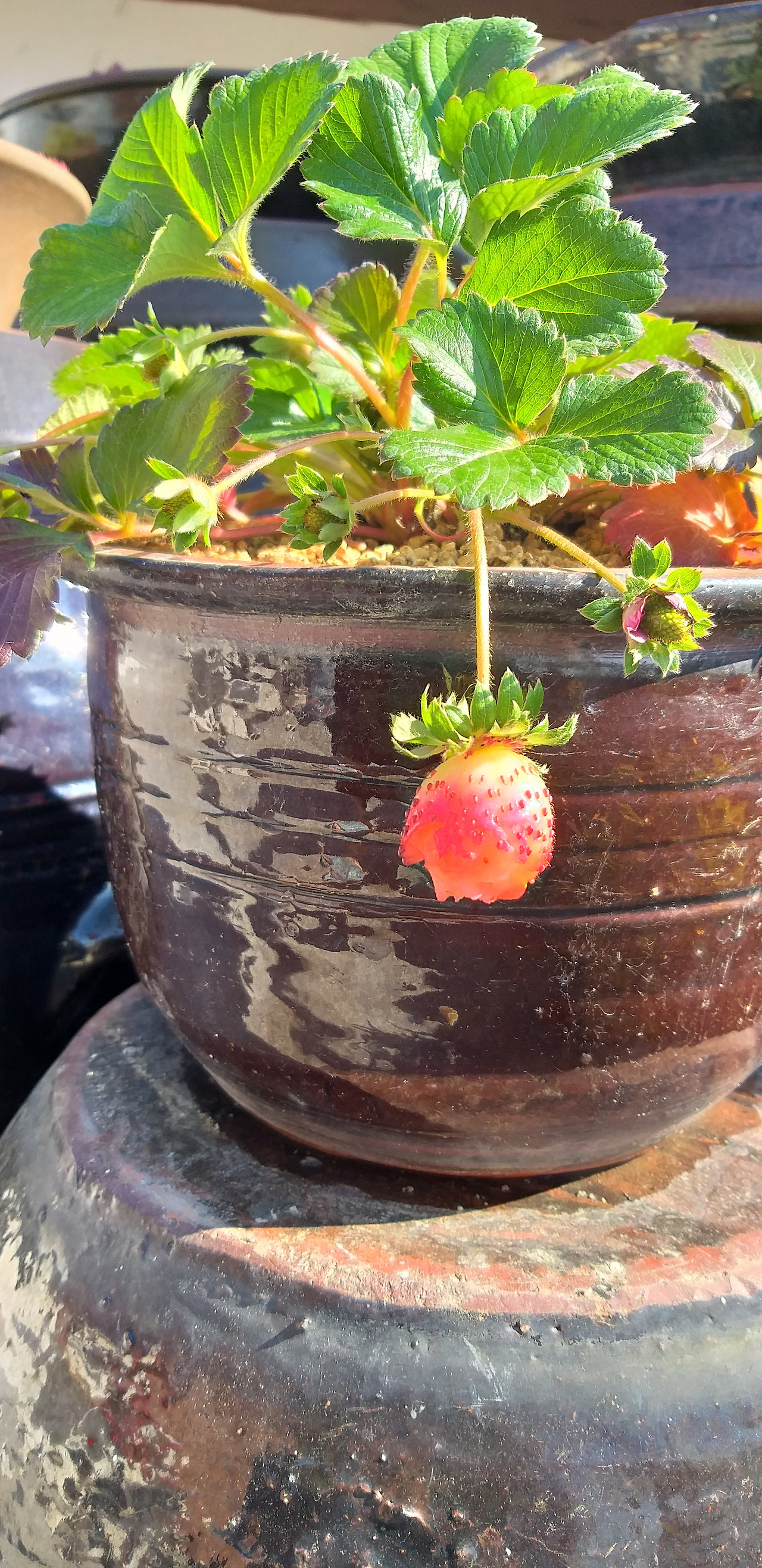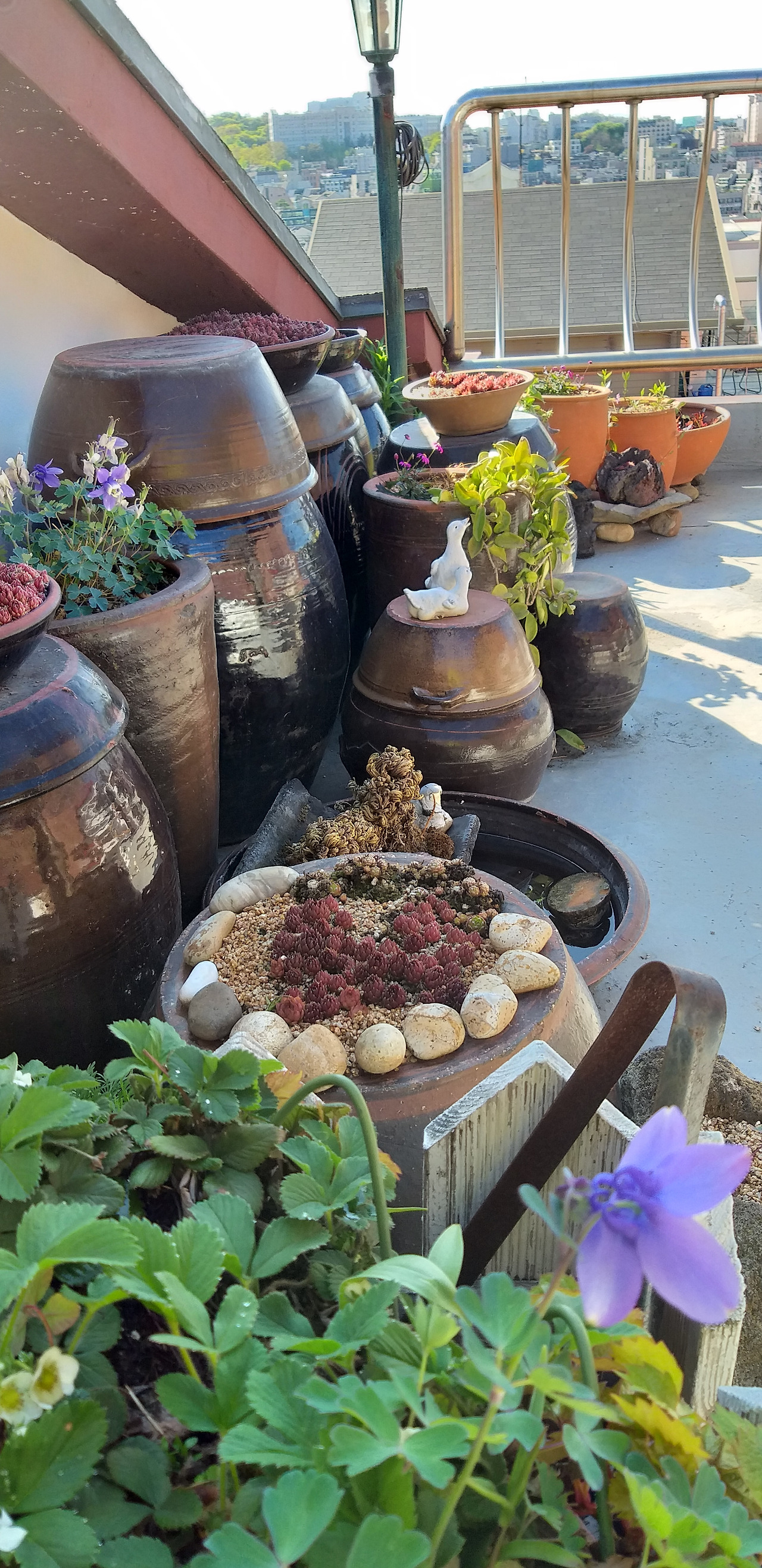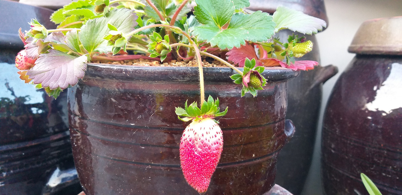 그중에 내 눈길을 끈 것은 붉은 딸기꽃이었다. 기존의 하얀 딸기꽃만 보다가 붉은색의 꽃을 보니 같은 딸기 꽃이라도 달라 보였다. 딸기꽃 화분을 사서 질그릇에 옮겨 심고 옥상 장독대 위, 하루 종일 햇빛을 볼 수 있는 자리에 올려 두었다.
