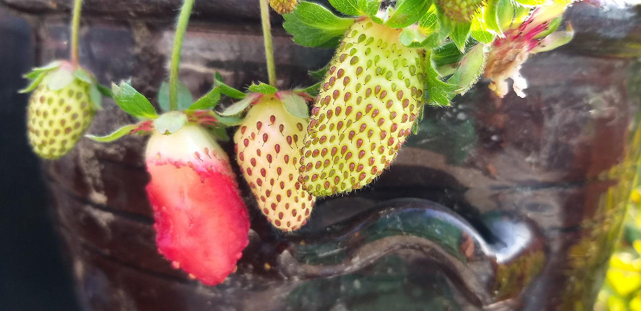 꽃이 피고 지더니 이내 딸기가 여럿 달렸다. 딸기가 익으면서 점점 붉은색을 띠고 나는 꽃을 보듯이 그것을 바라보았다. 딸기가 익으면 손녀가 직접 딸 수 있게 해야겠다.