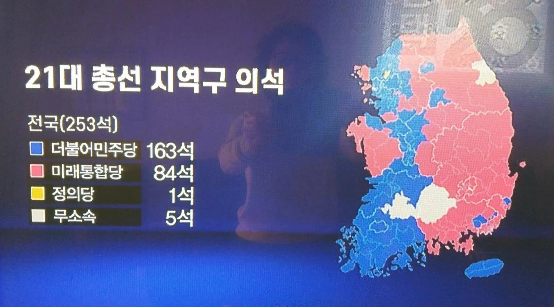 21대 국회 의석의 결과가 한눈으로 알아보기 쉽게 화면에 보인다. 파란색과 빨간색 두 가지 색이 분명하게 나뉘어 있다. 우리나라 지도, 호랑이의 가슴과 배는 파랗다. 호랑이의 등은 빨강 일색이다. 두 가지 색 외에 다른 색은 보이지 않는다.