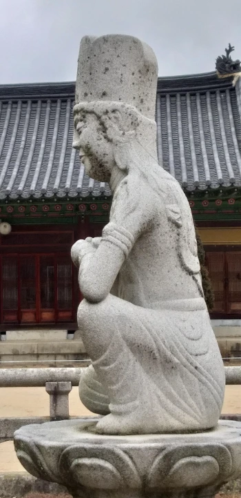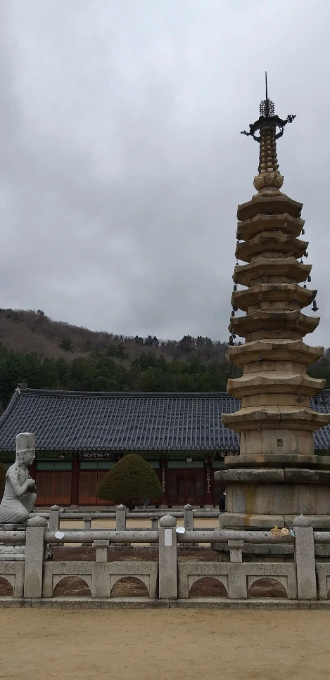 경내 마당에 우뚝 솟아있는 월정사 팔각 9층 석탑을 거론하지 않고 넘어가면 그 옆에 앉아 계신 석조보살님이 서운해하시겠지? 지금의 건물들은 전쟁으로 불타버린 후, 그곳에 다시 재건하였지만 팔각 9층 석탑만은 고려시대의 석탑이라 한다. 세월의 흔적이 묻어나는 탑이었다. 탑 옆에서 예불을 드리는 석조보살님의 옷깃 주름이 수려하다. 다만 보살님이 입고 계신 옷이 아직 헐지 않은 걸로 보아 보살님 역시 전쟁 이후에 다시 환생하신 듯하다. 이제라도 더 열심히 불공을 드리면 수 백 년 후에 이곳을 찾는 중생들에게도 보살님의 미소가 전해질 것이라 믿는다.