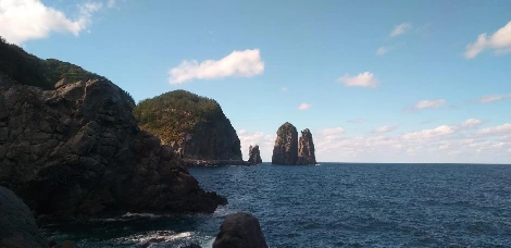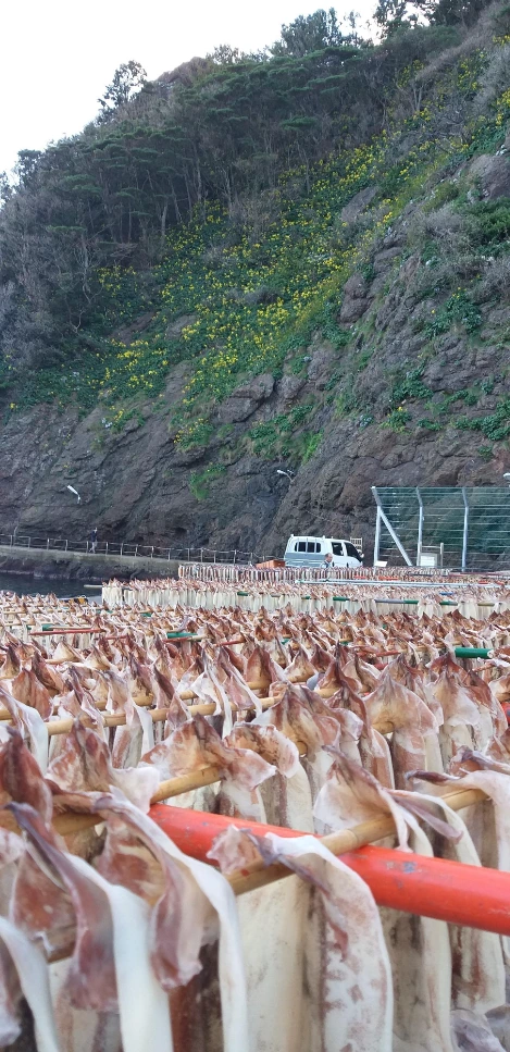오징어를 길게 꿰어서 널어 둔 항구에 발을 내딛자마자 다시 여행의 활력이 솟아났다. 해변가에 우뚝 솟아있는 기암절벽, 그 위에 핀 노란 털머위 꽃과 보라색 해국은 뱃멀미로 고통받은 나를 진정시켜주기에 충분했다.