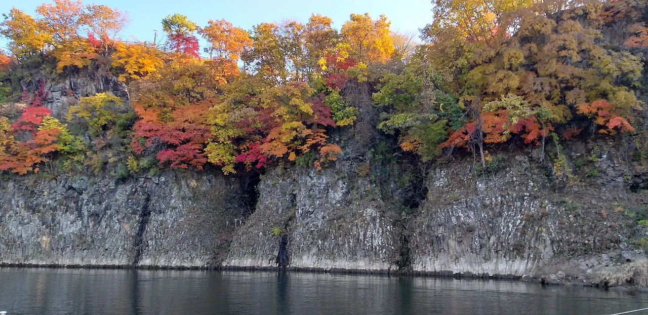 불덩이에 녹아내린 암석들이 차디찬 물과 만나 주상절리가 되었다고 합니다. 물과 불의 합작품, 냉정과 열정이 만들어낸 자연의 조각품은 누구도 범접할 수 없는절벽을 이루고 있습니다. 하지만 절벽 끝 아스라한 곳에서 마음껏 제 빛깔을 뽐내고 있는오색단풍들, 아무리 곧고 가파른 주상절리라 해도 단풍의 섹시한 도발만큼은 어찌할 수 없었나 봅니다.